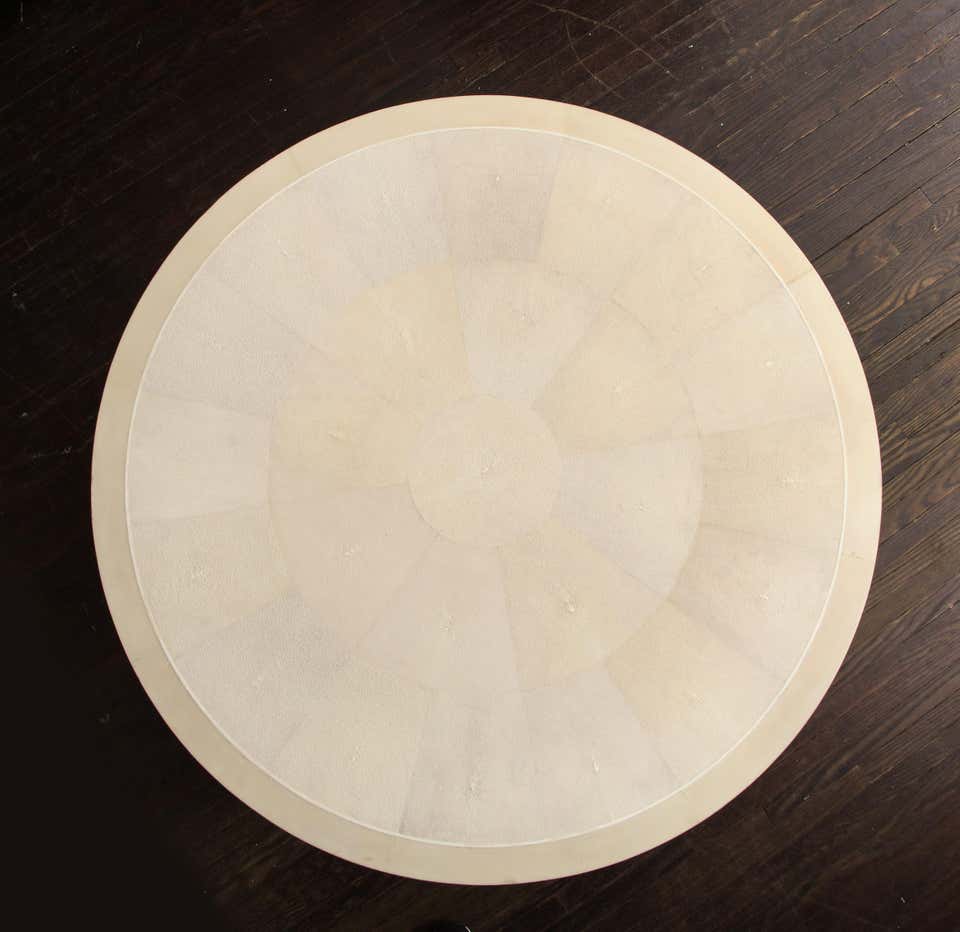Made to order, custom round shagreen and parchment cocktail table with bone trim. Please inquire with Venfield for finish options and pricing. Dimenions:.