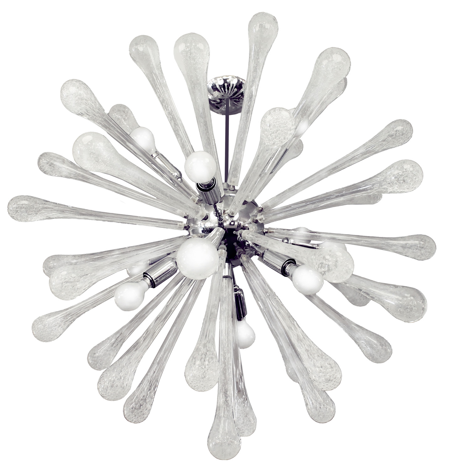 Hand-blown clear Murano glass teardrop sputnik-style chandelier in chrome. The teardrops on this piece have a unique "texture" created by air bubbles within the glass.