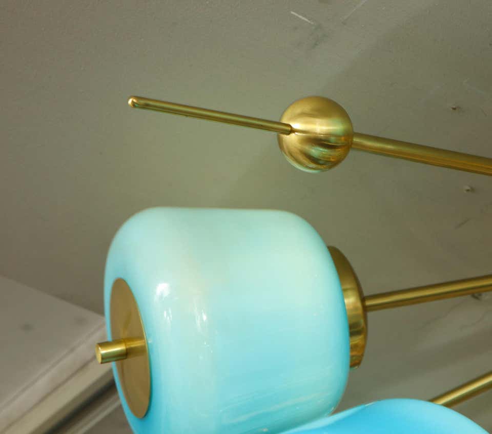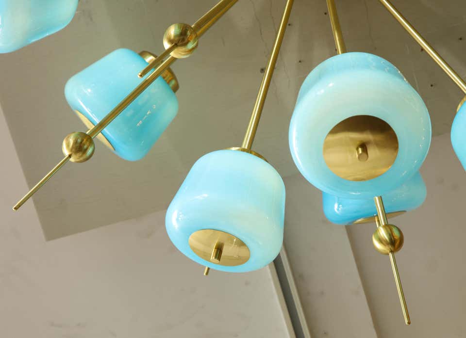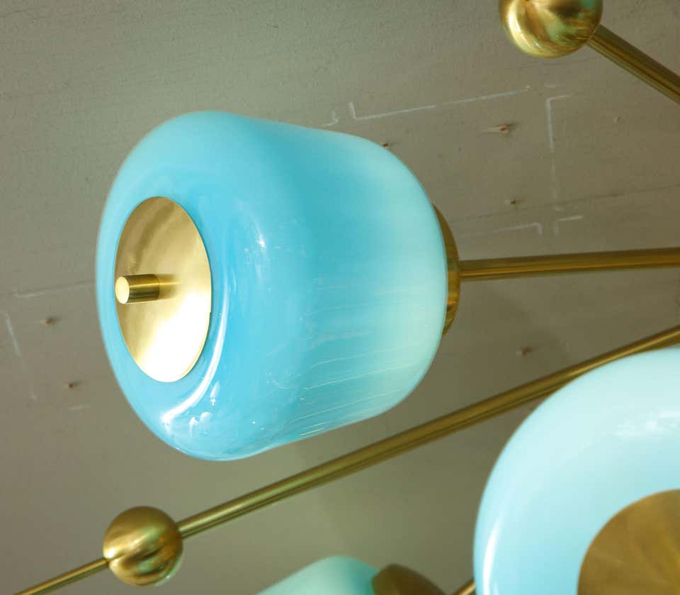 Beautiful turquoise milk glass flush mount chandelier in polished brass Currently out of stock but available for custom order. Customization is available in different sizes, glass colors (white, sanded clear and turquoise) and finishes. G9 base light sockets are used for this chandelier. Please specify the overall Inquire with Venfield about estimated production lead times.