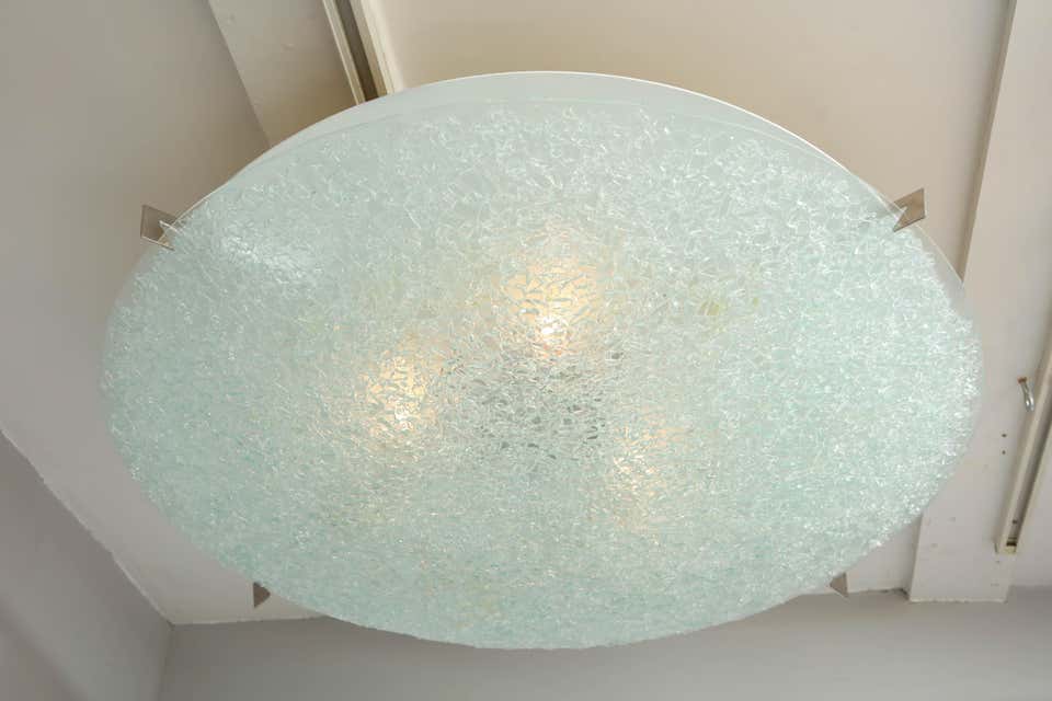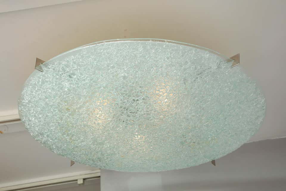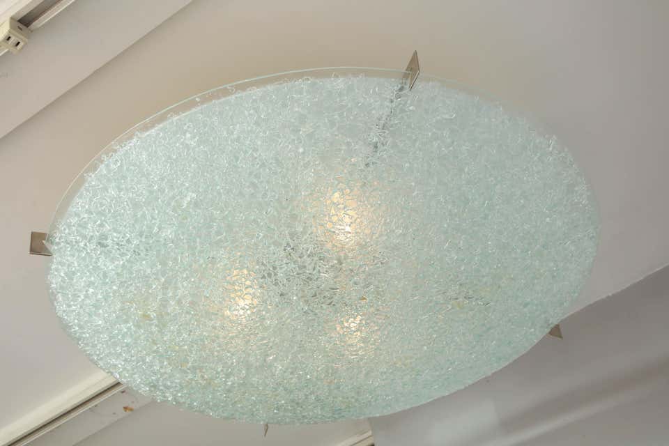 Dome glass flush mount light fixture with chrome hardware. This floor sample is available as is for immediate purchase.
