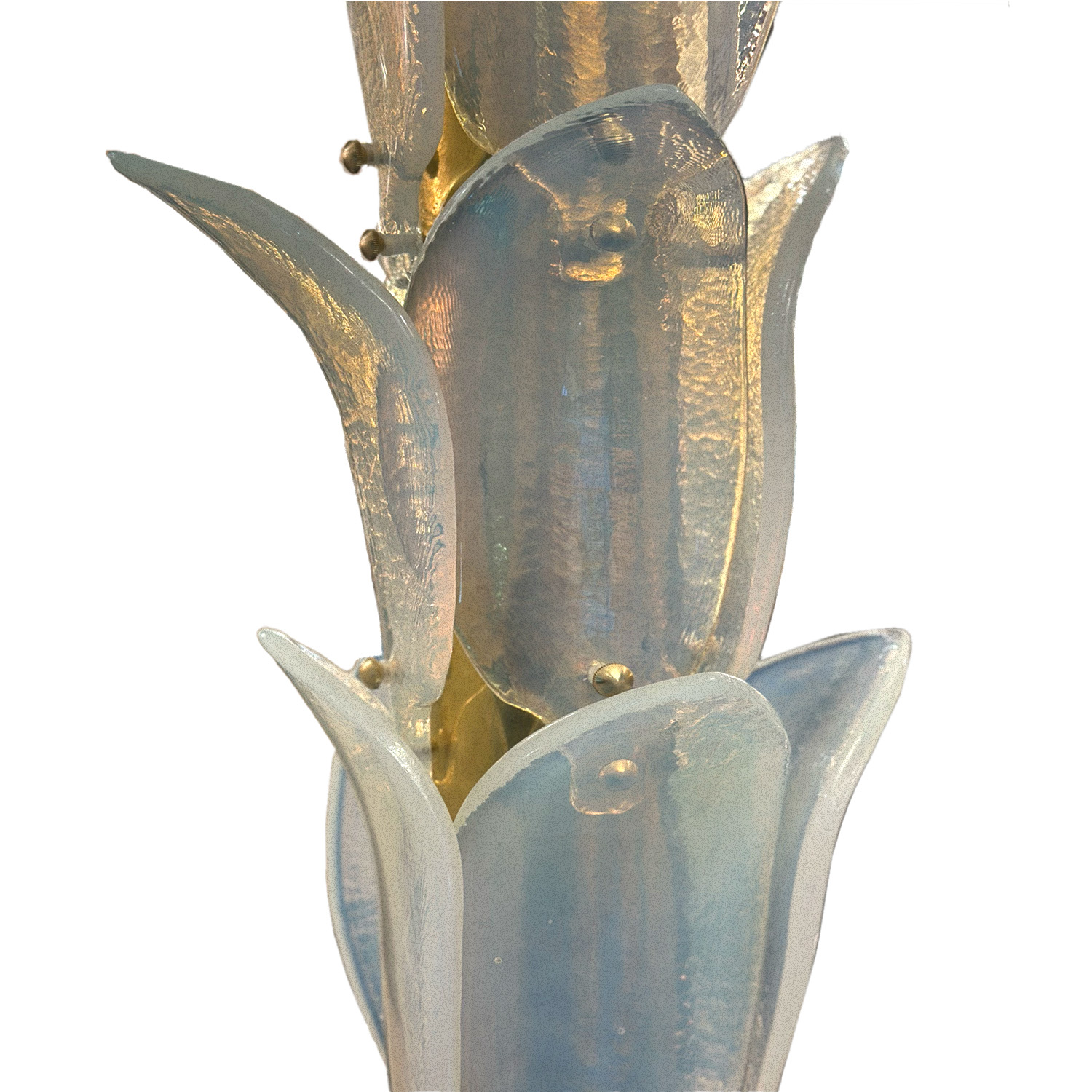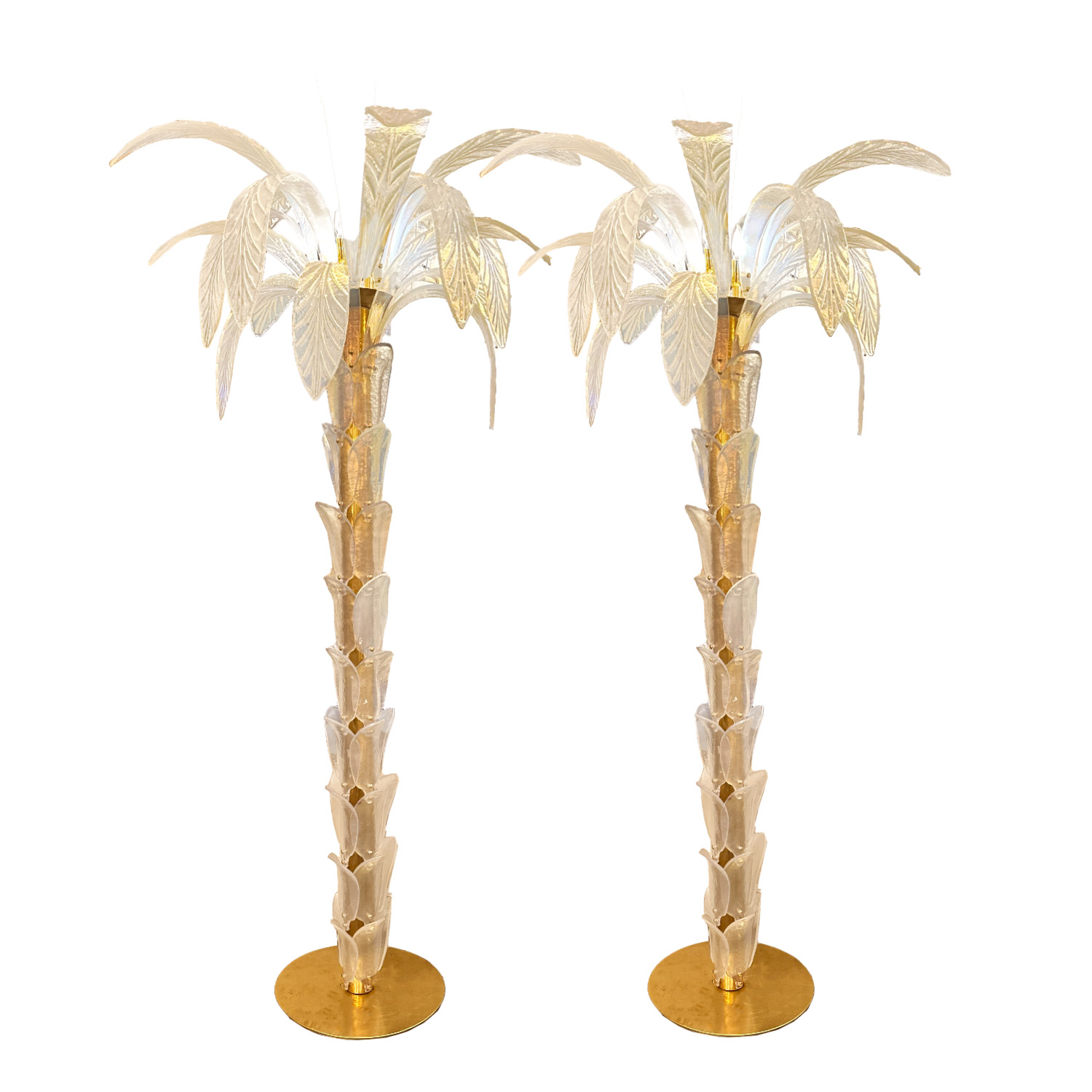 Hand-crafted iridescent Murano glass and polished brass palm torchieres. A popular Mid-Century design, these figurative lamps have "trunks" of white iridescent Murano glass over polished brass. Glass fronds sit atop the palms, concealing and diffusing five light bulbs. Both artistic and functional, these torchieres serve as a unique piece of decor.