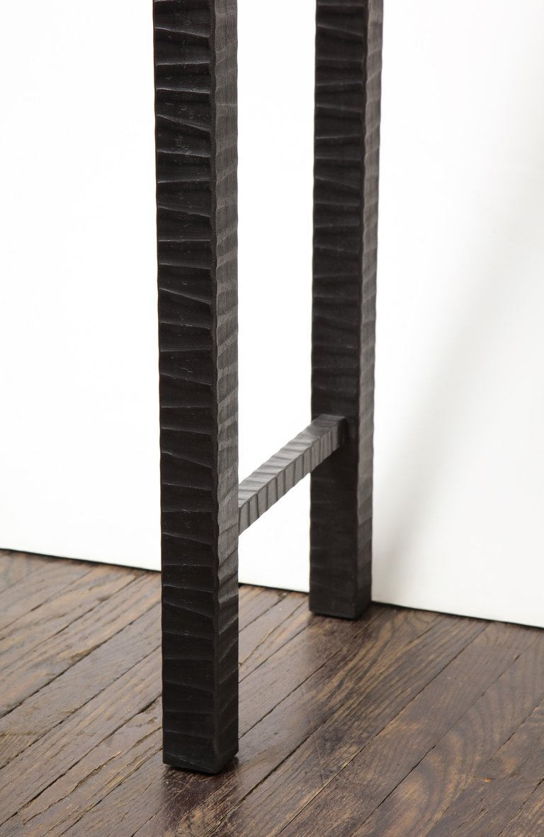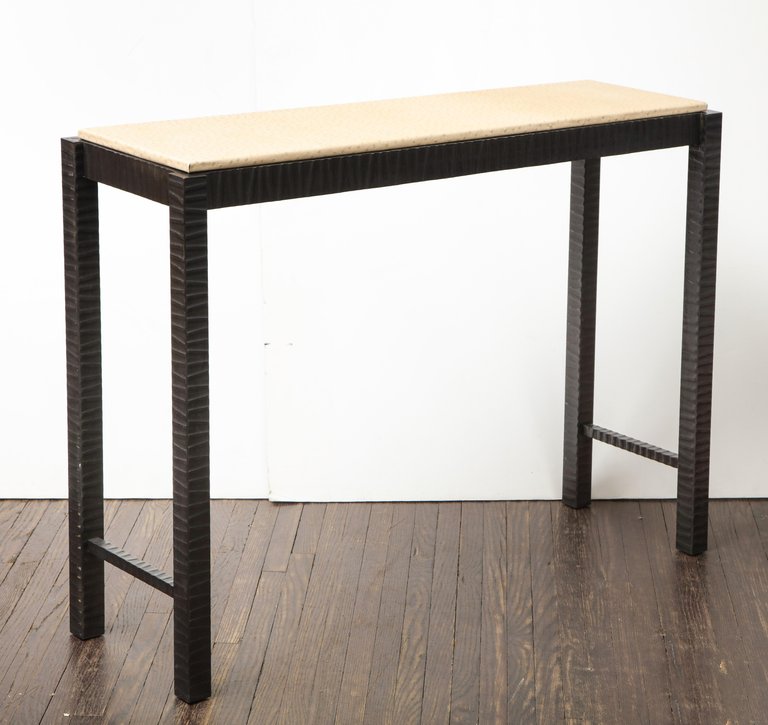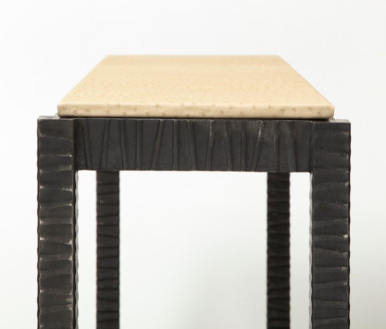Embossed Edelman leather ostrich console Currently out of stock but available for custom order in different sizes and finishes. The top can be made in a different leather, stone, glass, or customer-owned material. Please inquire about estimated production lead times.
