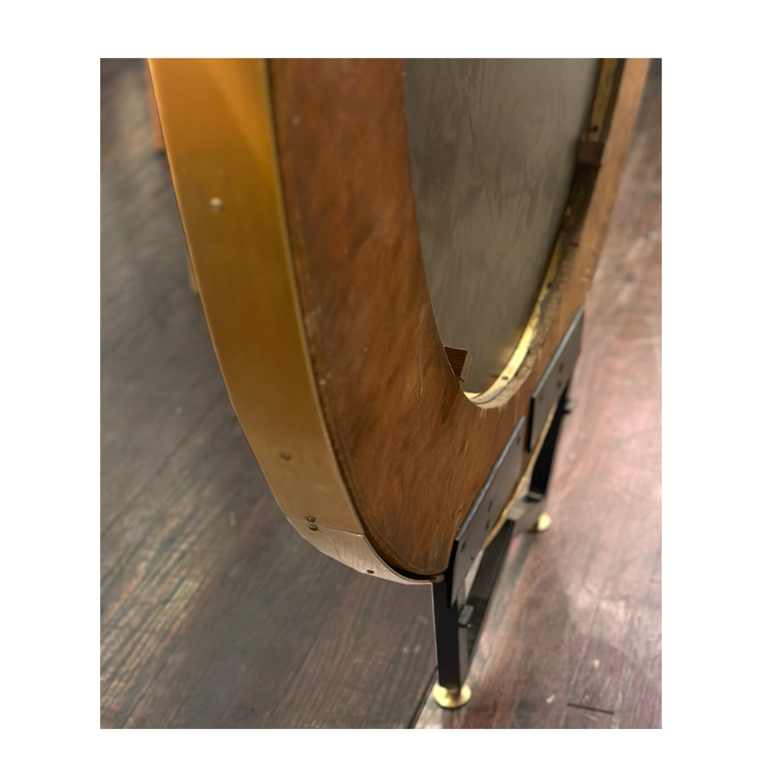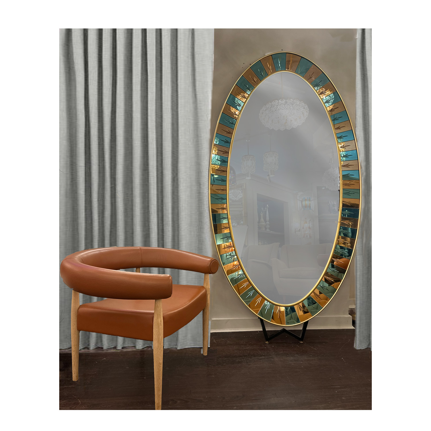 Renowned for its exquisite mirrors and glasswork, Cristal Arte established itself early on with its innovative designs and outstanding craftsmanship. The company gained prestige in the 1950s and 60s for its chic and unique mirror designs. Particularly celebrated was its use of colorful Murano glass, wrap-around, brass-band frames and skilled reverse-etched detailing. Mirrors from this period are still highly sought after today by collectors and admirers. This large-scale, oval floor mirror features a frame of alternating orange and blue Murano glass tiles with an etched leaf-motif frame. The mirror stands on a -shaped black iron base with brass footing. This is a stunning piece that is sure to be the centerpiece of any room it graces. Currently gracing Venfields NYC Showroom.