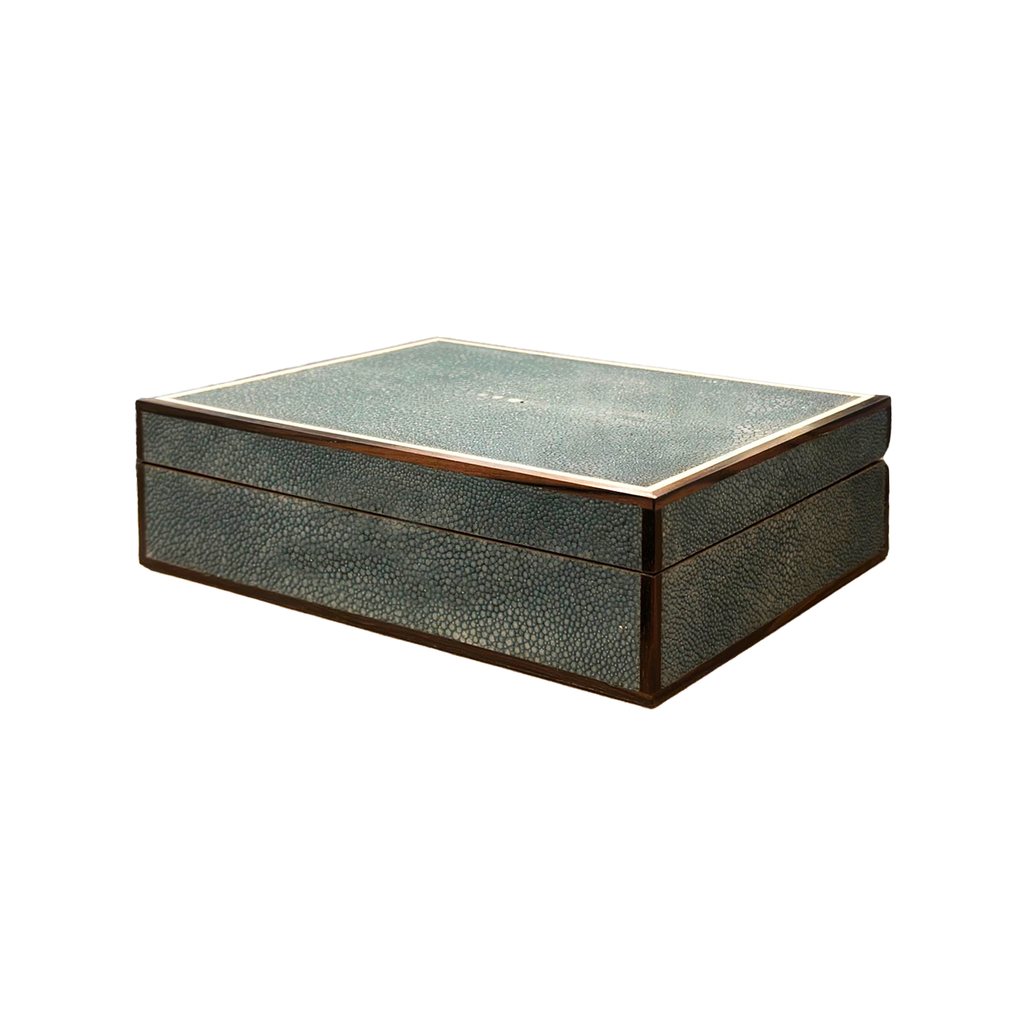 Elegant, exotic, and unmistakably refined, shagreen has long captivated those with a discerning eye for luxury. Derived from stingray skin, this richly textured material first appeared in 13th-century Japan, prized for its durability and tactile grip on samurai sword handles. But its transformation into a hallmark of opulence began in 18th-century France. Madame de Pompadour, the influential mistress of King Louis XV and an unmatched patron of the decorative arts, played a pivotal role in elevating shagreen from utility to prestige. Known for her impeccable taste and deep involvement in shaping French style, she championed fine artisans—including Jean-Claude Galluchat, whose shagreen-covered objets ’art she made fashionable across European high society. By the early 20th century, shagreen experienced a glamorous revival. French Art Deco designers such as Jean-Michel Frank and Clément Rousseau embraced its subtle sheen and organic patterning, incorporating it into sleek furniture, jewelry boxes, and vanity sets. The material’s soft, pebbled finish became synonymous with quiet luxury and bespoke craftsmanship. A study in subtle opulence, this artisan-crafted decorative box is wrapped in premium stingray shagreen—each panel selected for its naturally rich texture and soft, matte sheen. The shagreen’s distinctive surface, long favored by French nobility and Art Deco designers, brings a tactile elegance that instantly elevates any interior. Refined bone inlay adds contrast and crisp geometry, framing the piece with sophistication. Inside, you’ll find a flawlessly finished Macassar ebony lining—deep, lustrous, and dramatically grained—offering not just beauty, but a sensorial experience every time the lid is lifted. Polished stainless steel hinges assure smooth operation for a lifetime of use. This piece is ideal for storing fine jewelry, watches, or keepsakes—but its presence alone makes a statement. Whether placed atop a console, bedside, or private dressing area, it reflects an appreciation for craftsmanship, history, and the rare materials that define true luxury.