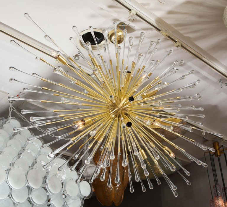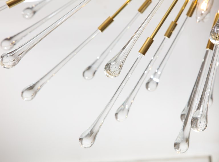 Custom extra large glass teardrop Sputnik chandelier in brass finish. Customization is available in different sizes, finishes and glass colors.