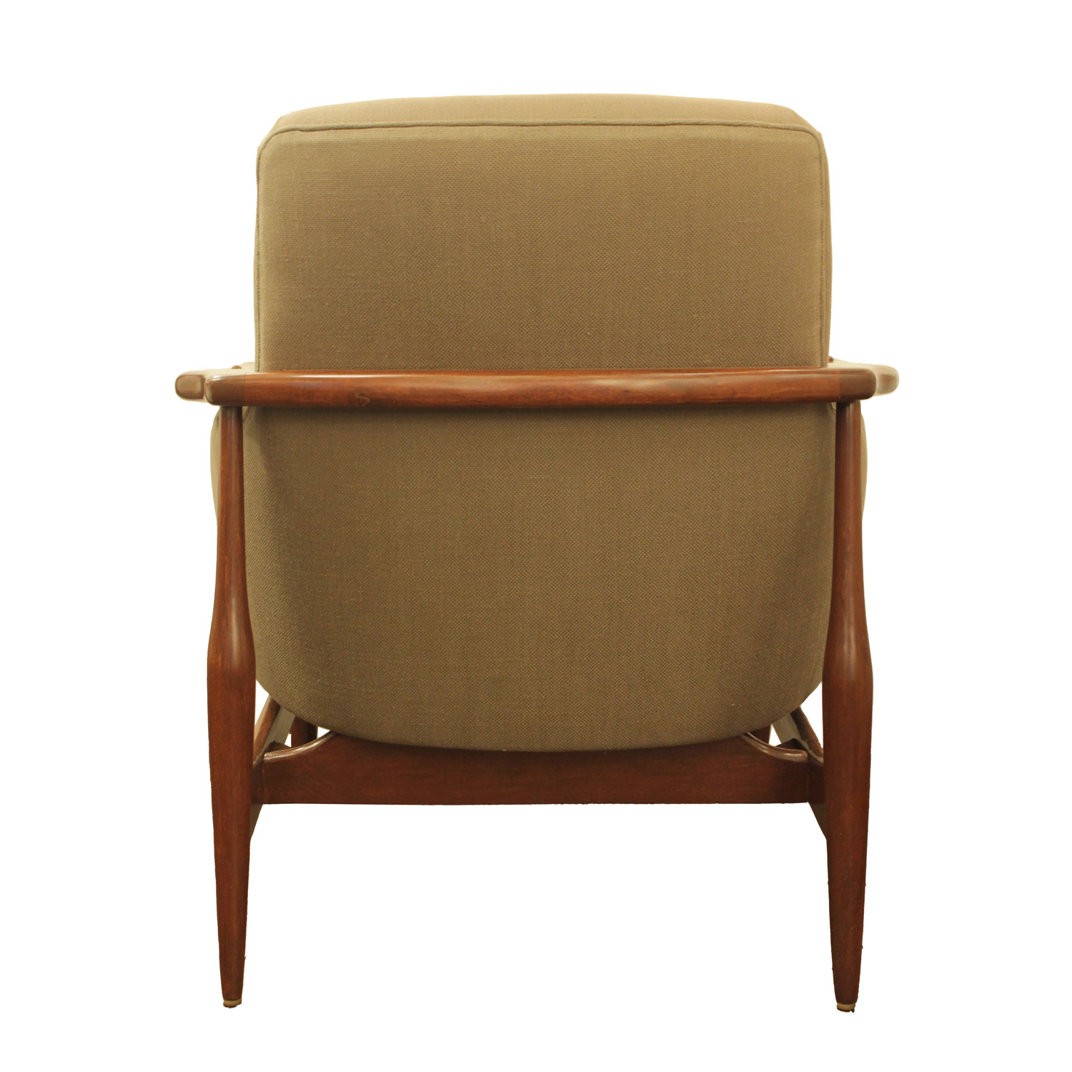 Stylish pair of Danish Modern lounge chairs with button detail and sculptural walnut frame in the manner of Finn Juhl. Newly refinished and upholstered by Venfield in Holly Hunt Khaki color fabric., Denmark, 1970's.