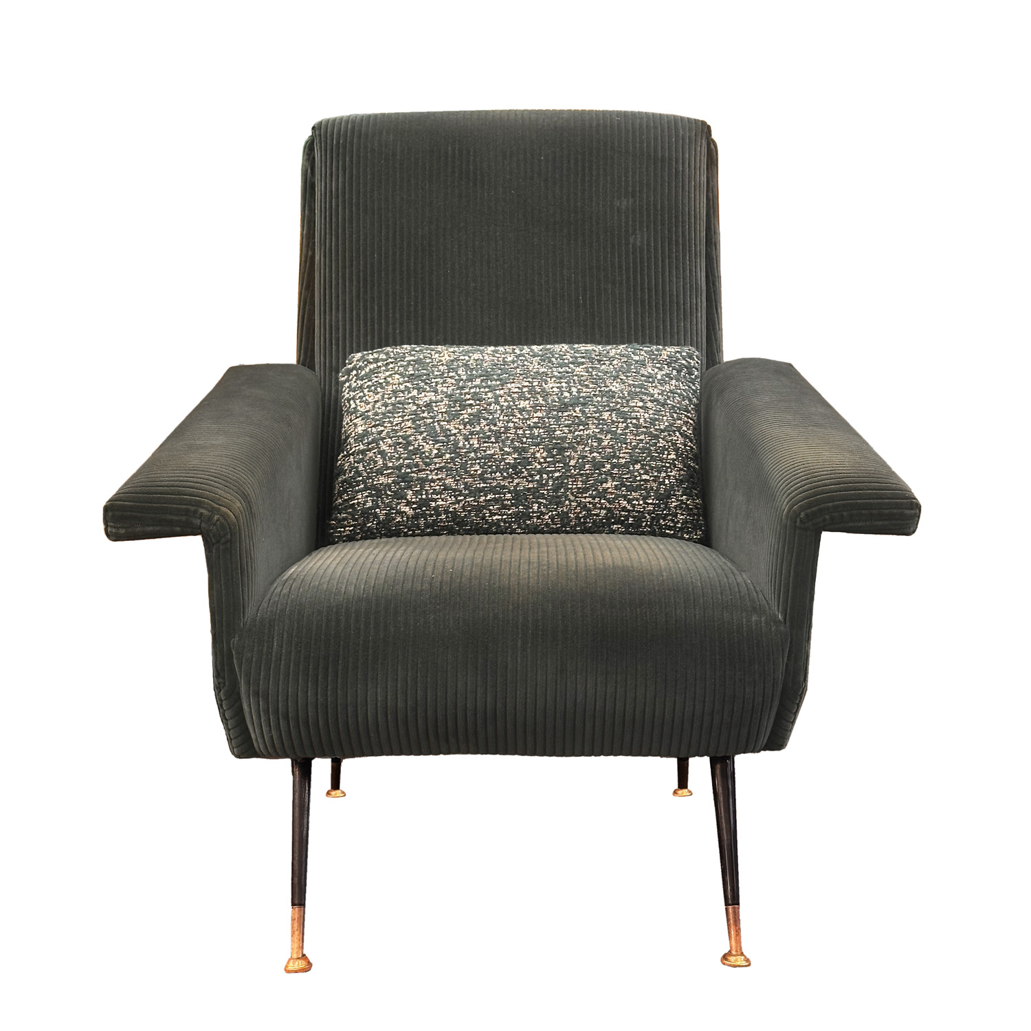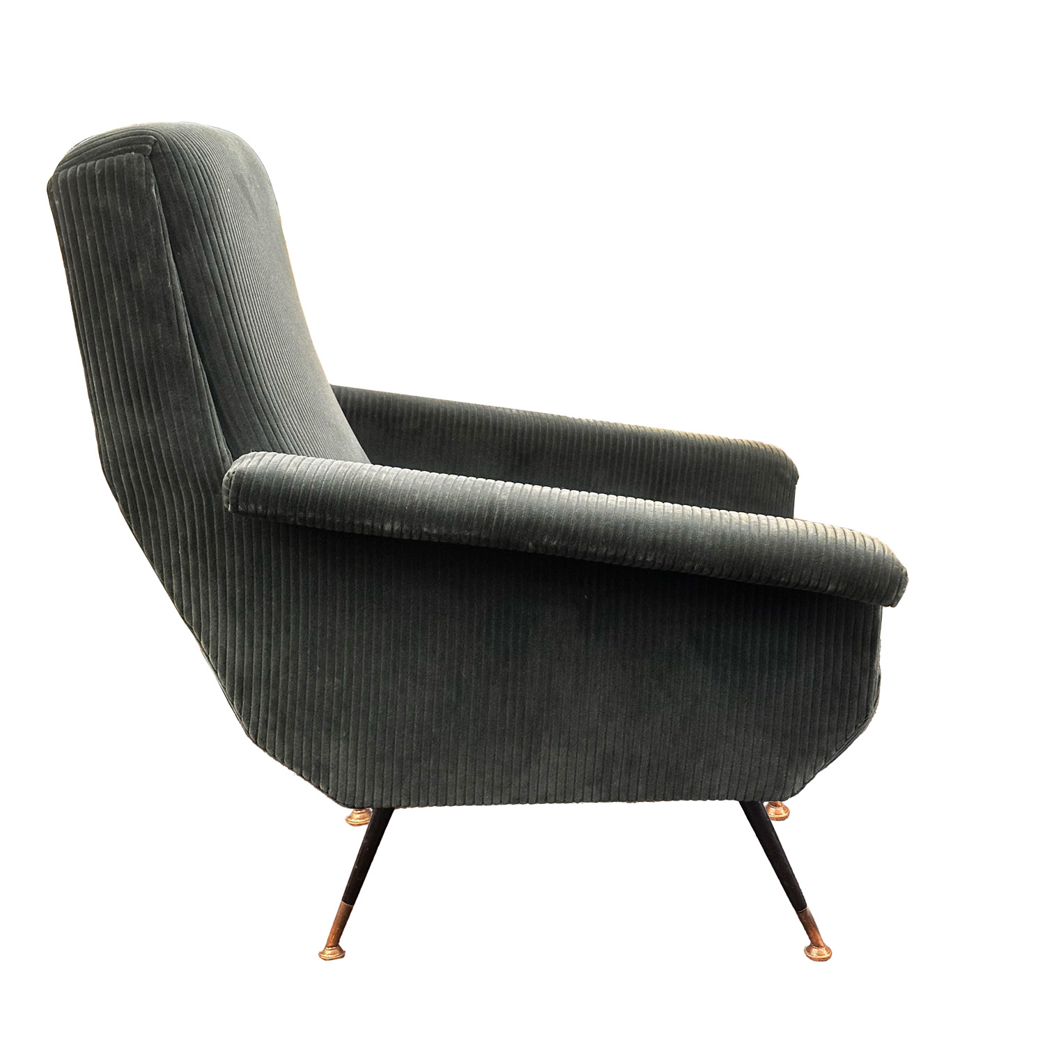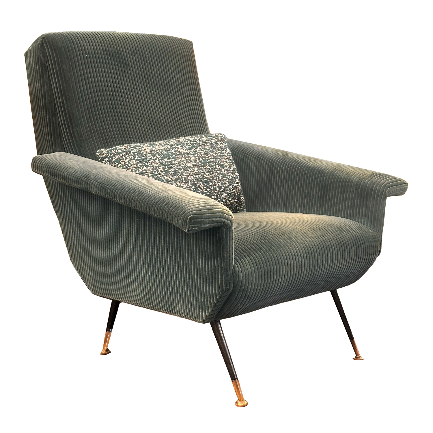 The Mid -Century Modern period of design is an era of unparalleled creativity and innovation marked by a major shift in design philosophy. Gone was the ornate excessive style of the past in favor of modern simplicity and functionality. Nowhere was this more prevalent than in Italy where Mid-Century Modern furniture design flourished in response to the changing attitudes and lifestyles of the post WWII society. Experimenting with new materials designed for their usability like plastic, fiberglass, plywood and high density foam and embracing new technologies in manufacturing that put these materials to use, Italian designers created the distinctive, visually striking, bold, yet elegant “Italian style” that established Italy as the center of modern design. This pair of quintessential Italian lounge chairs is attributed to designer Giuseppe Rossi. Made in the 1950s, their sloping arms, elegant, tapered, brass capped legs and angled shape are indicative of Italian Mid-Century furniture. Upholstered in a dark green, wide-ribbed corduroy with coordinating lumbar pillow, they add a touch of sophistocated elegance.