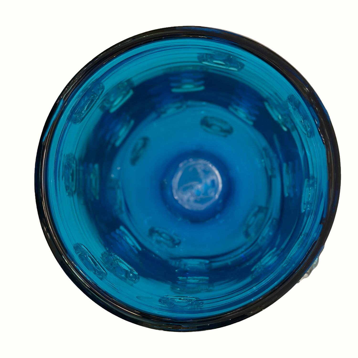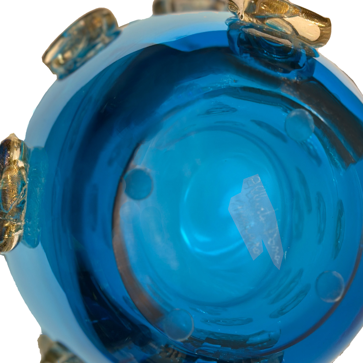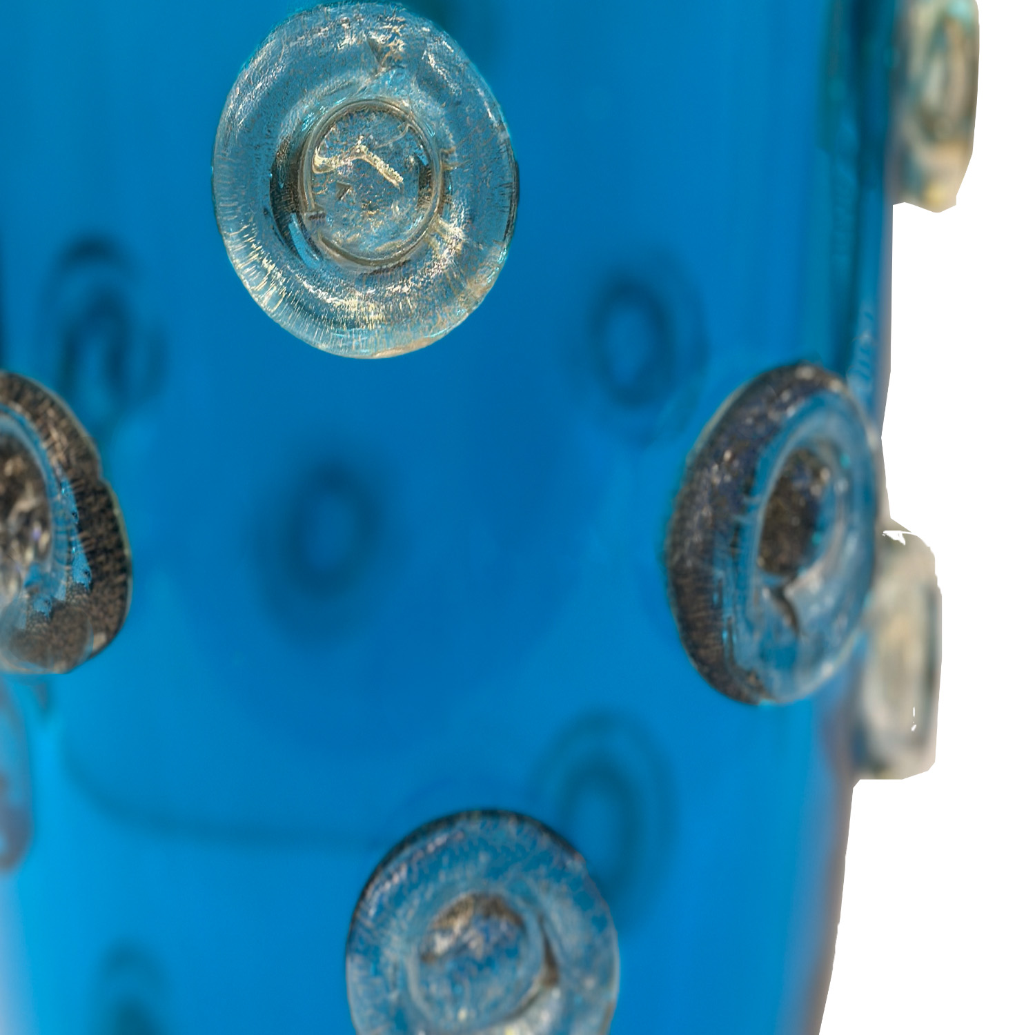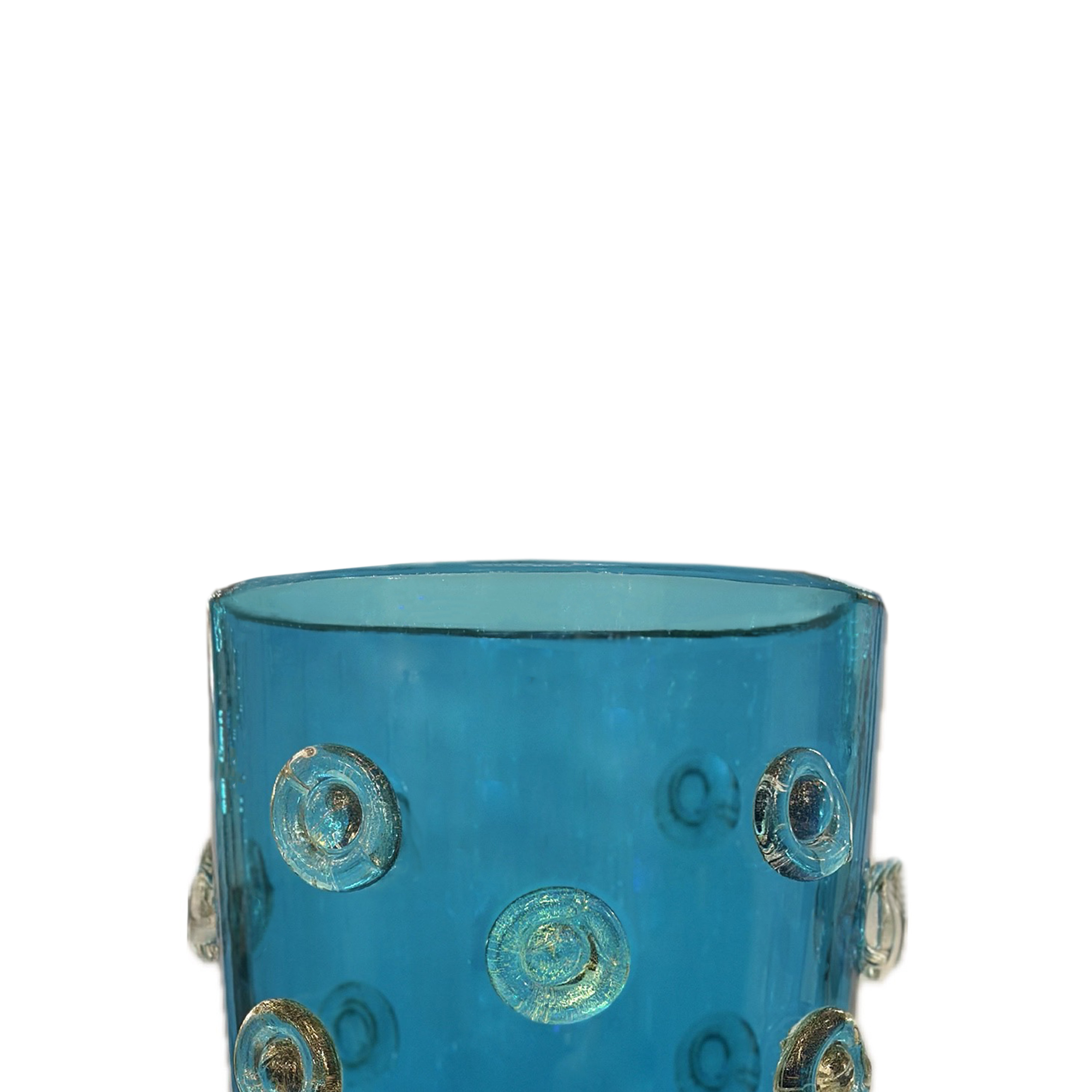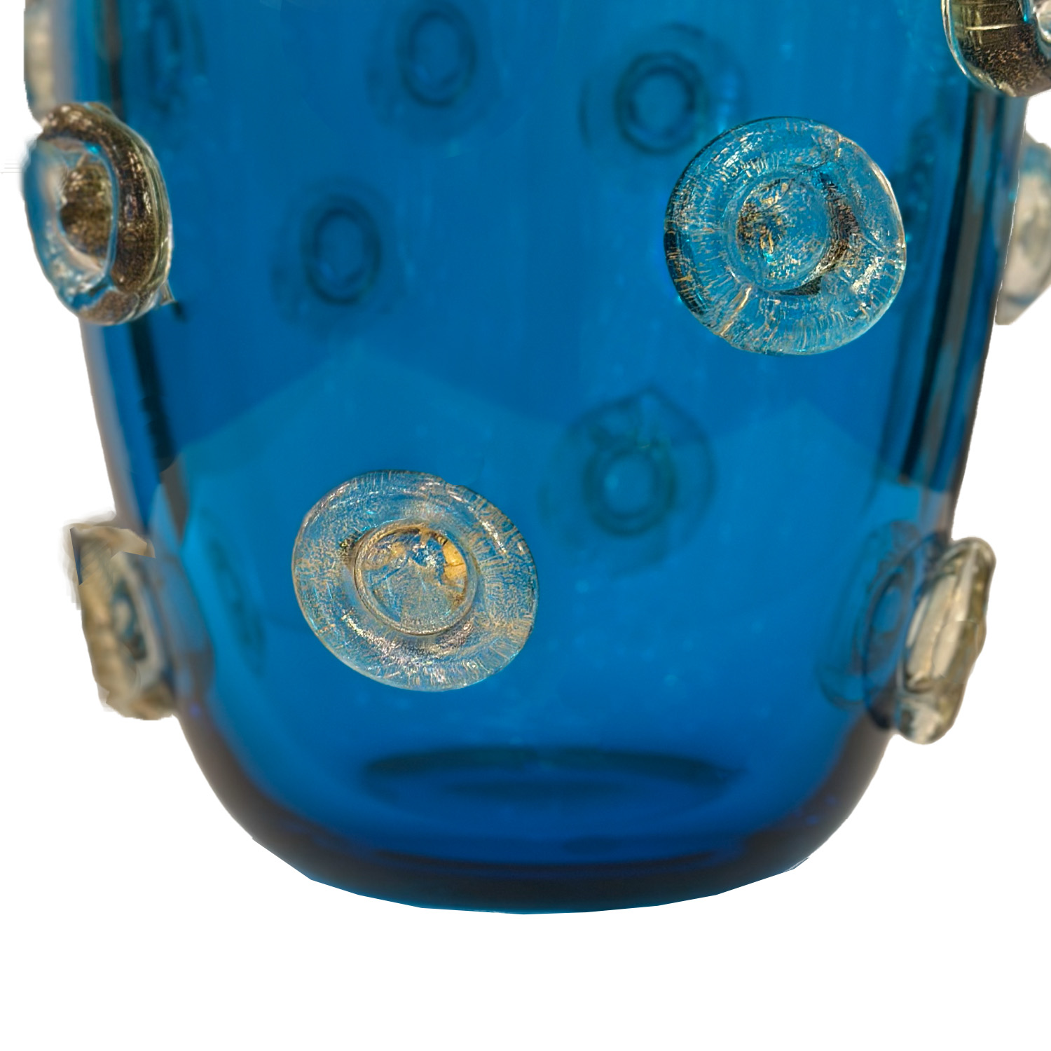 Deep blue color Murano glass vase decorated with applied dot design in clear glass with gold leaf inclusions. Italy 2023.