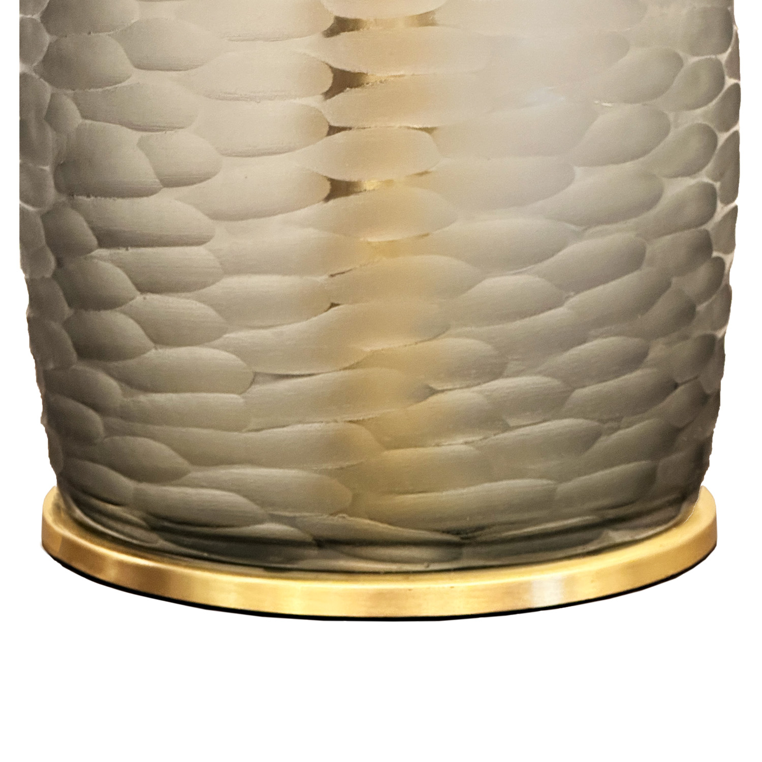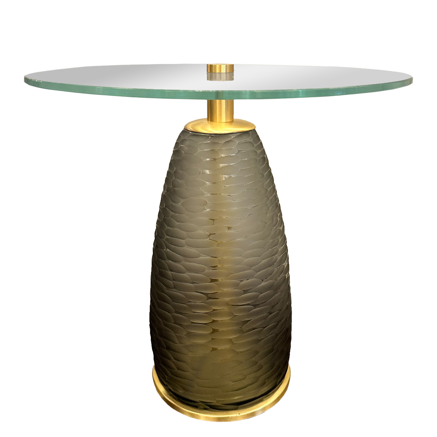 Elegant olive-colored Murano battuto finished glass side table with brass details and a thick, round starphire glass top.