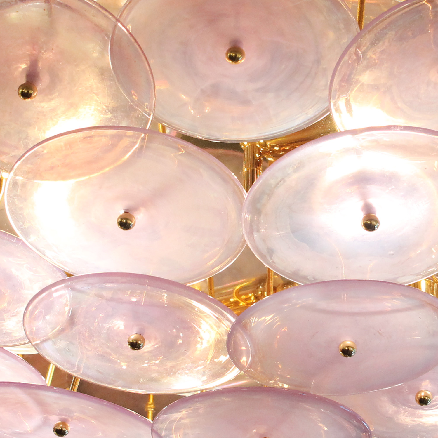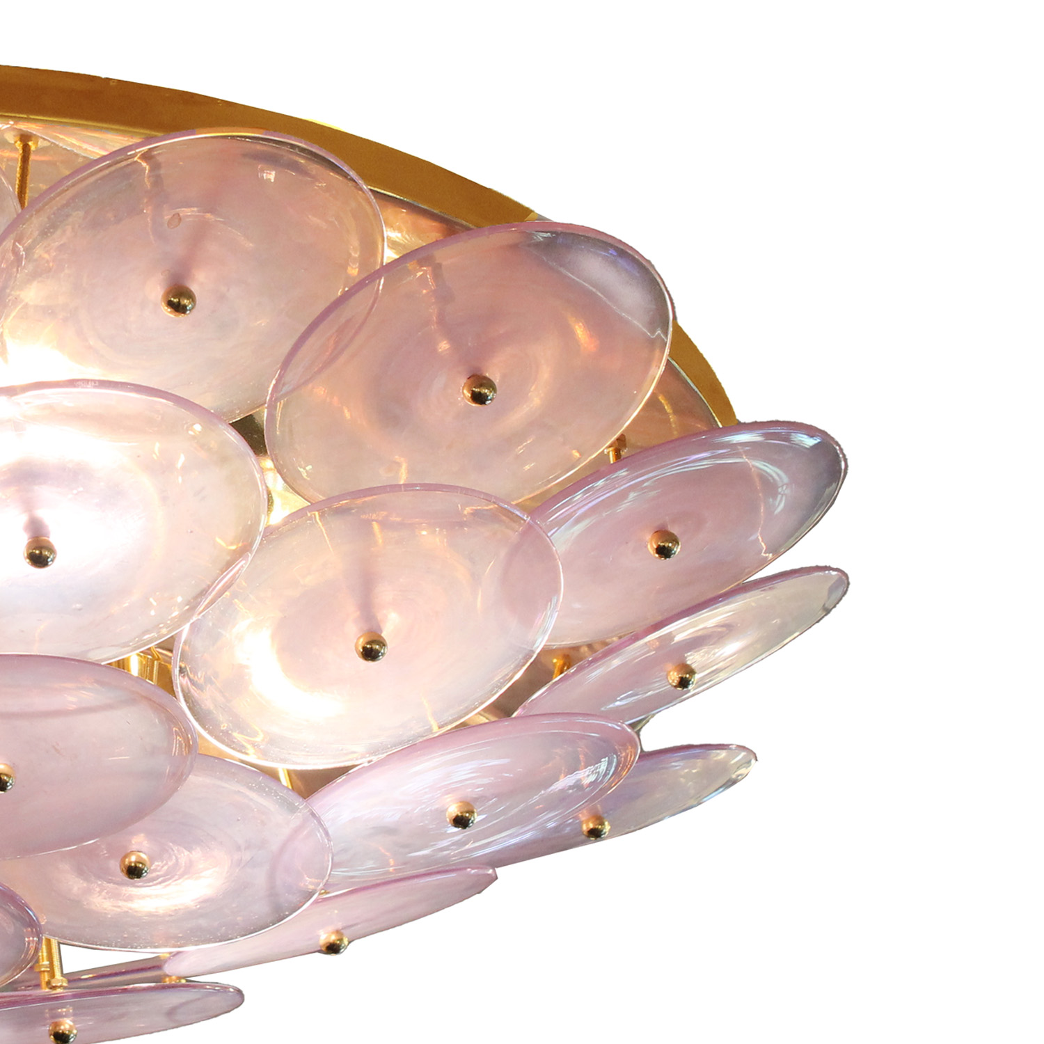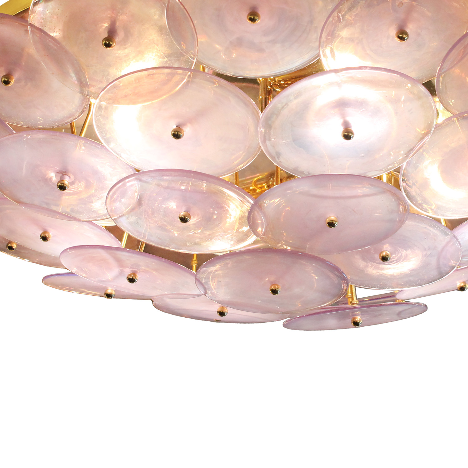 Murano "Alex" iridescent purple glass disc flush mount fixture with polished brass body. Italy. Custom Please inquire with Venfield. Lead time 6-8 weeks.