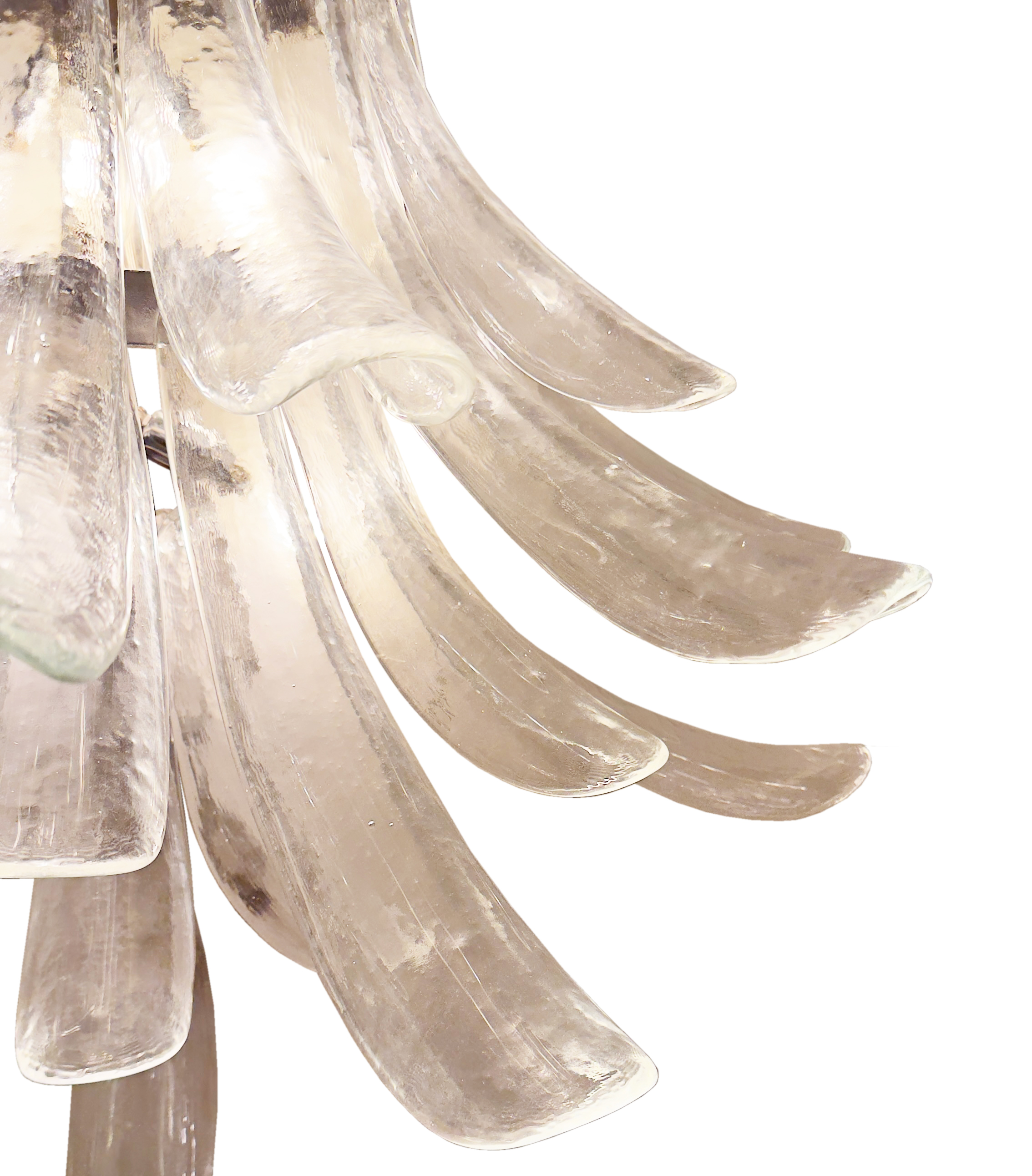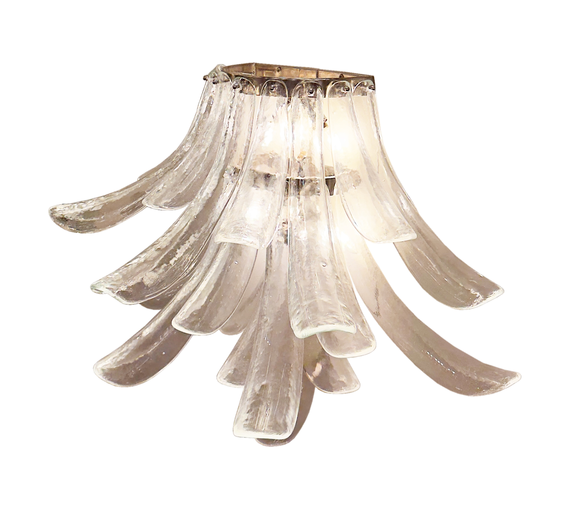 Pair of Murano clear glass petal sconces arranged in cascading tiers on a chrome frame. Sconce is illuminated by five, 60 watt candelabra bulbs.