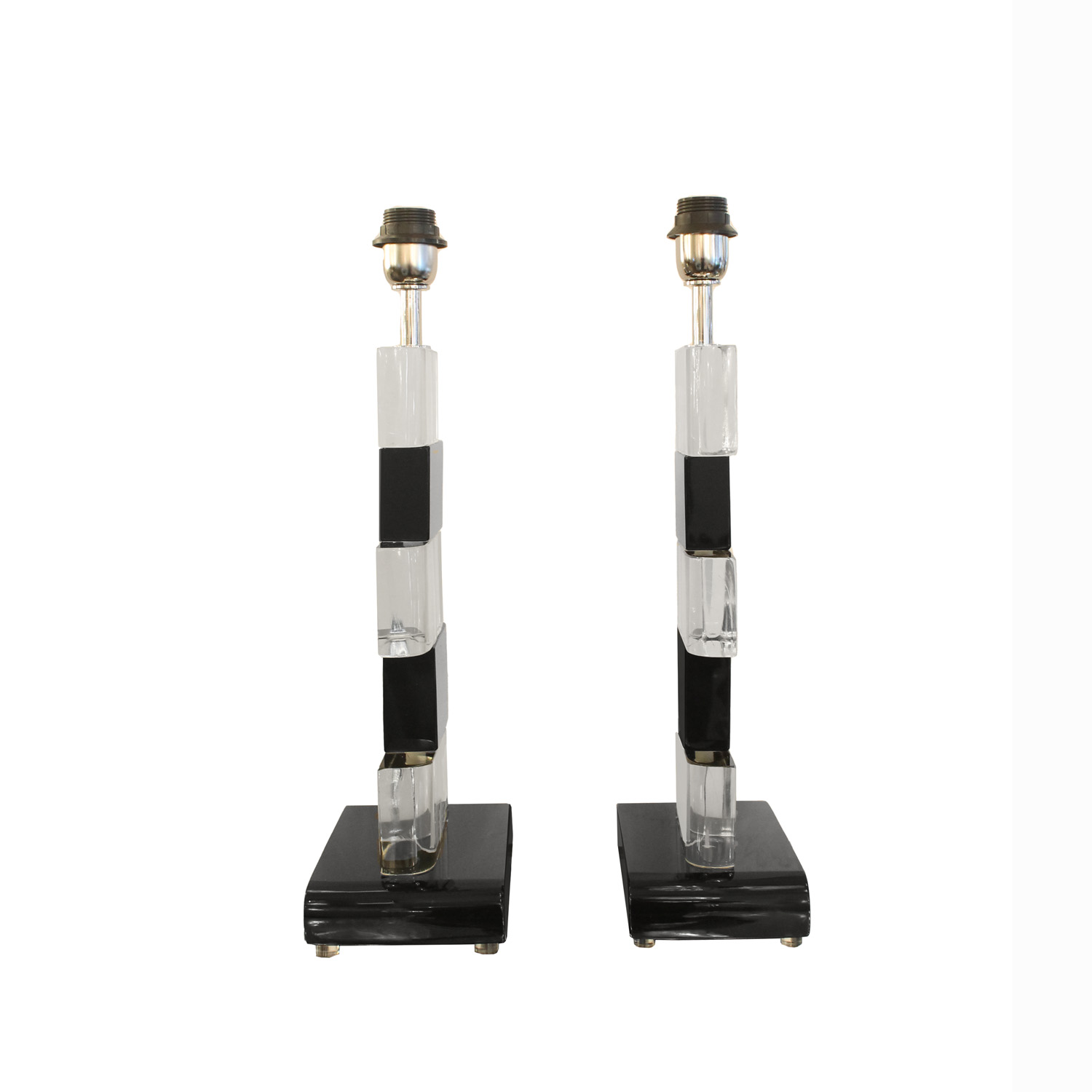 Pair of alternating stacked Murano glass block and chrome table lamps. Italy Glass blocks pivot around a chrome stem and can be arranged differently.