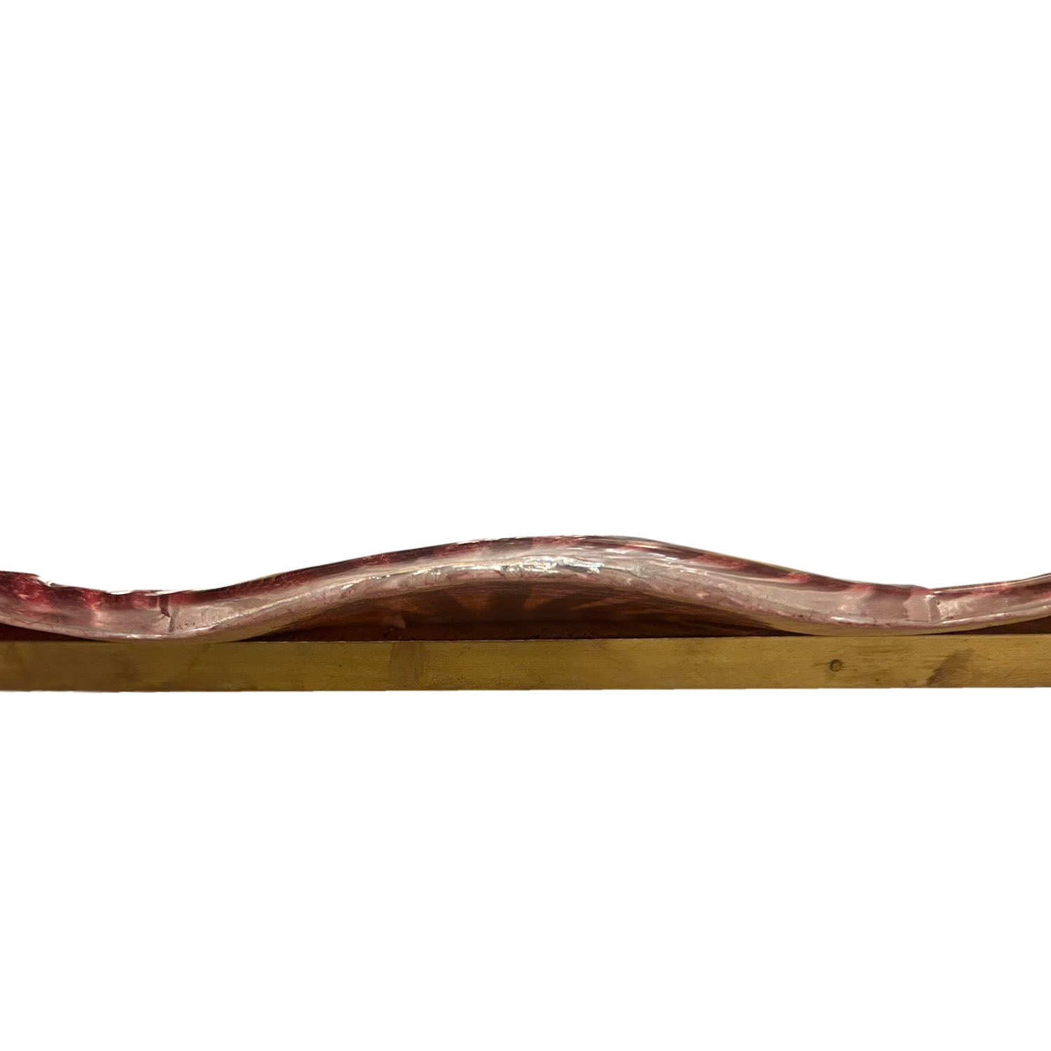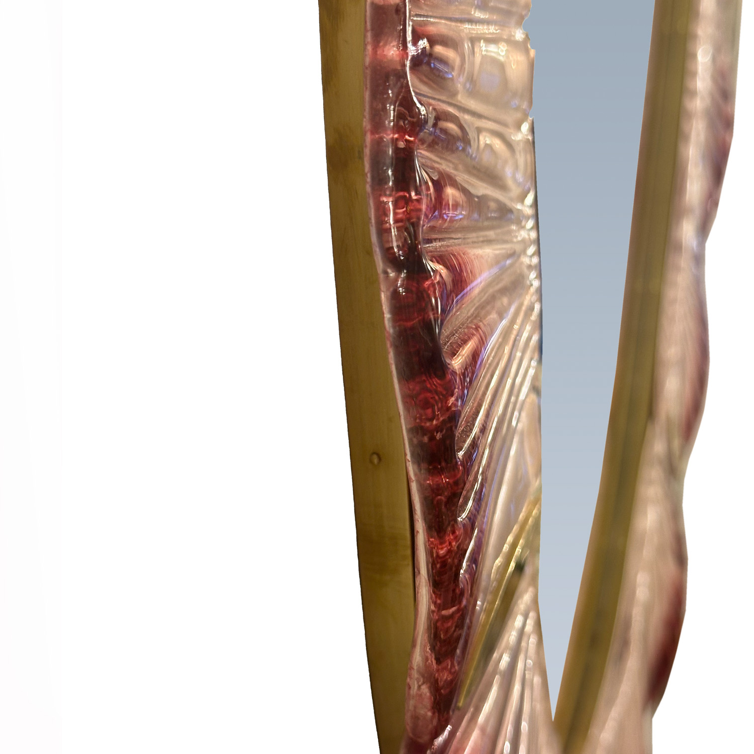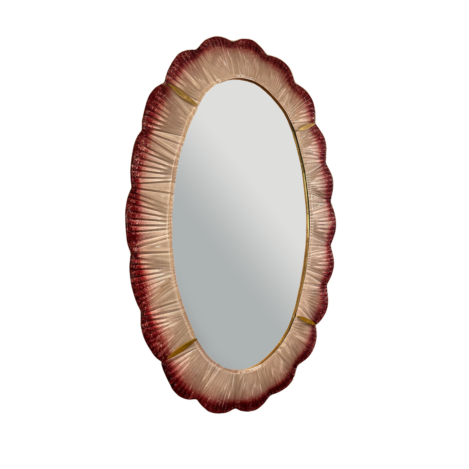 This oval-shaped mirror beautifully showcases the artistry of Murano glassmaking. Characterized by its elegant shape, this mirror features a unique sfumato technique, which creates soft transitions between colors and tones, reminiscent of the delicate beauty found in nature. The mirror's petal-like frame is adorned with intricate brass details that add a touch of sophistication and luxury. A captivating focal point in any room.