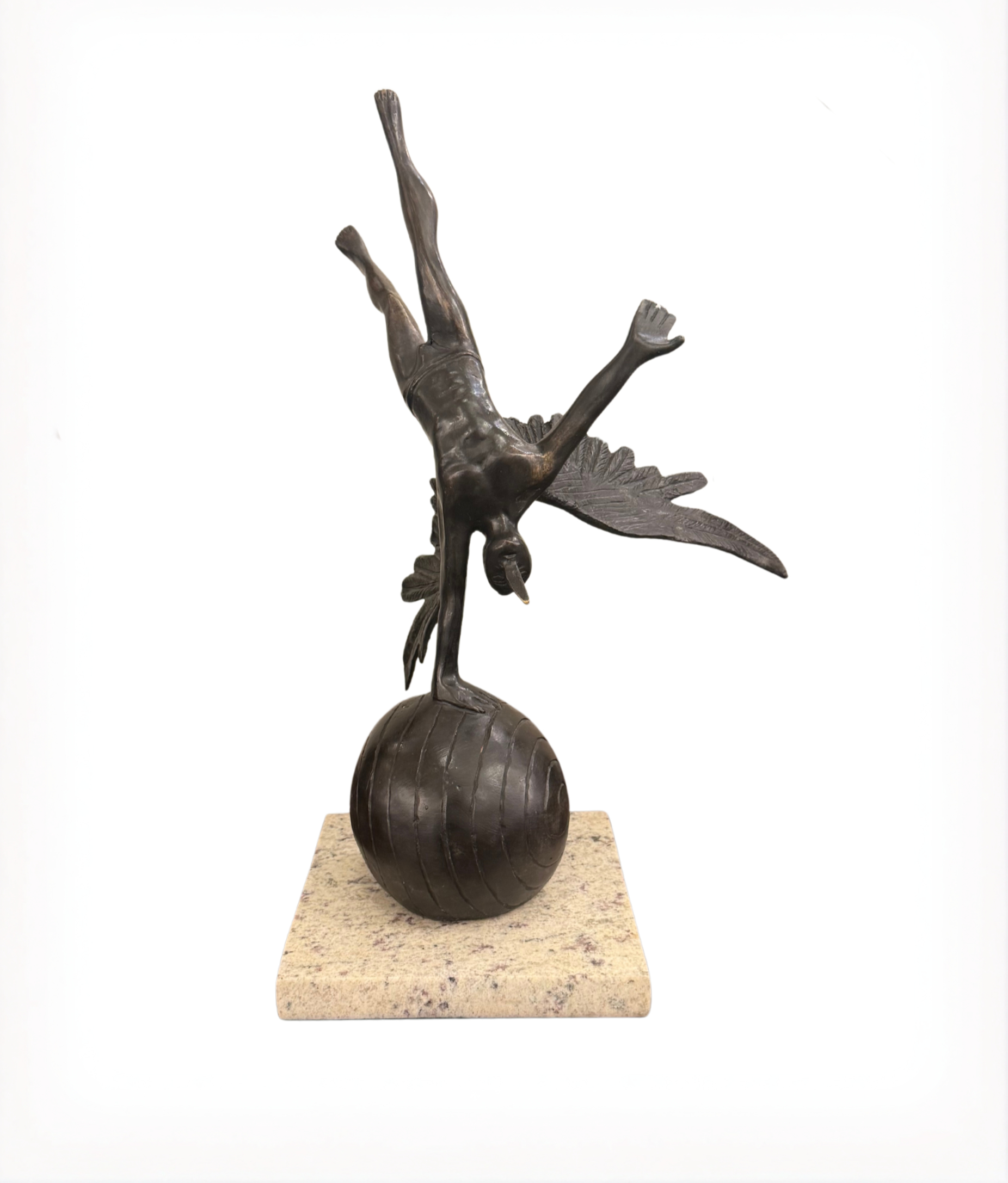 This bronze sculpture by celebrated Mexican artist Jorge Marín exemplifies his signature themes of balance, flight, and mythic masculinity. A muscular, winged male figure balances himself on one arm, legs extended in an impressive acrobatic handstand. He wears a beaked carnival-style mask—an emblem of transformation, performance, and the hidden self. Rendered in rich patinated bronze and mounted on a black marble base, the piece exudes dynamic tension and surreal elegance. Marín’s work explores the dualities of body and spirit, restraint and freedom—each element meticulously cast to reflect motion and emotional weight. Signed by the artist Origin: Mexico, 21st century.