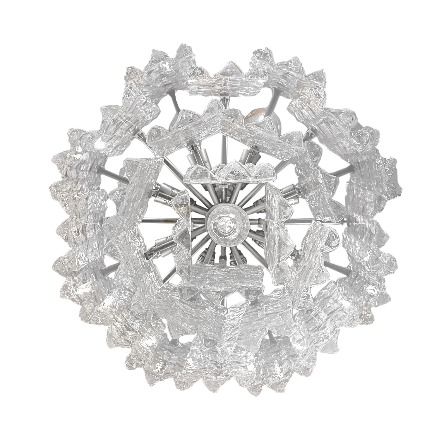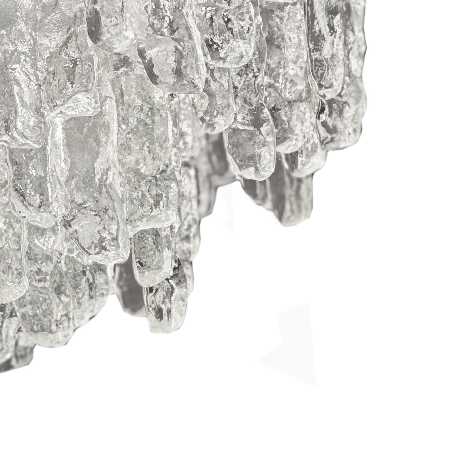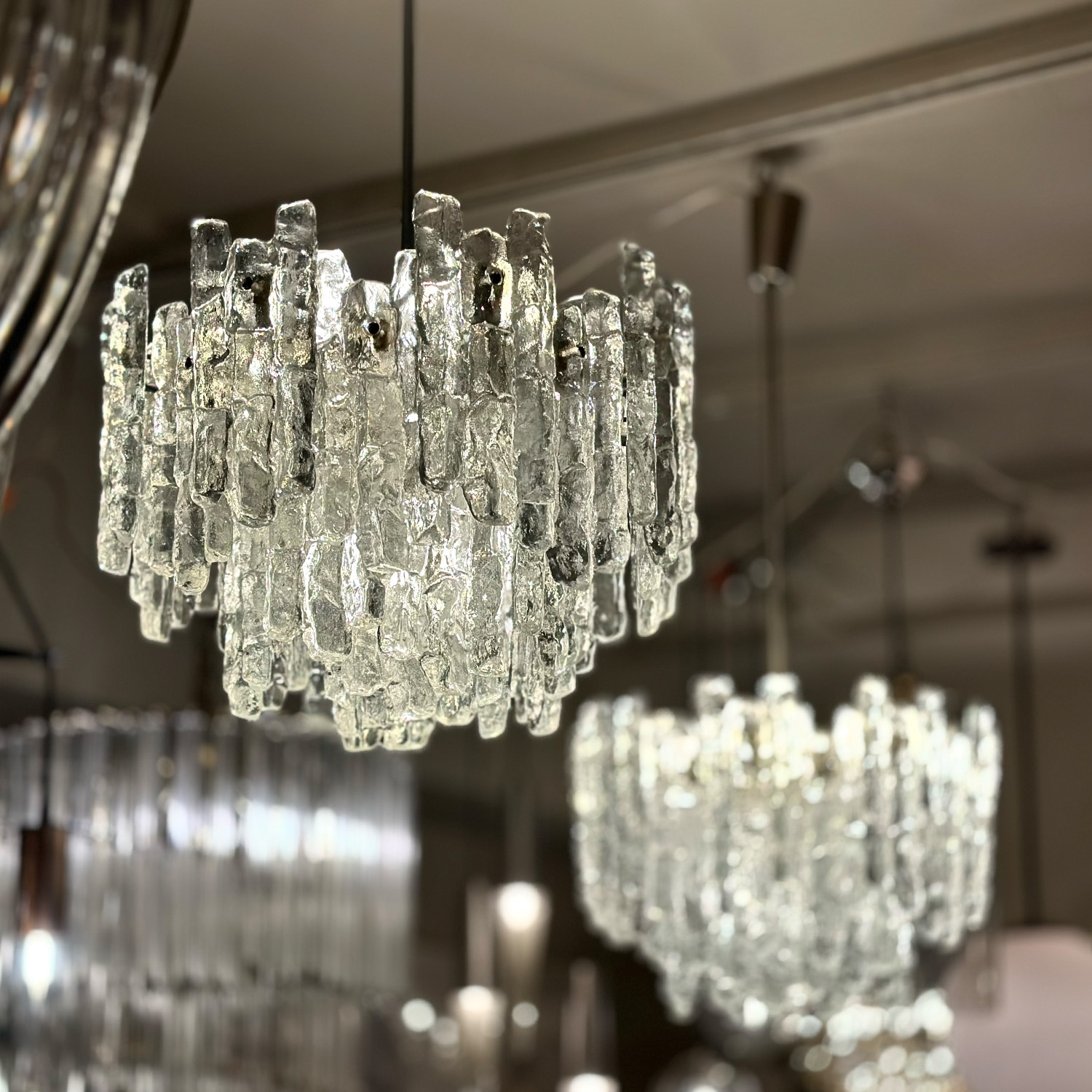 No one produced more ice glass in the 1960s than Austrian lighting company JT Kalmar. Although it had earned its medal as a foundry specializing in cast bronze pieces that helped define the Vienna style in the 20th century, Kalmar will forever be known for its extensive work with ice glass. During the 1960s, the company went all in working exclusively with the art glass, employing it in every sconce, flush mount and chandelier produced. This tiered chandelier exemplifies both the craftsmanship and artistry of Kalmar. Glass tiles shaped like staggered "sticks" are arranged at alternating depths in three concentric tiered rings around nine lights. Not only visually beautiful, ice glass was also an They hang from a chrome canopy and stem supporting a steel frame. Venfield currently has a pair of ice glass pendants in our NYC showroom. Priced and sold individually.