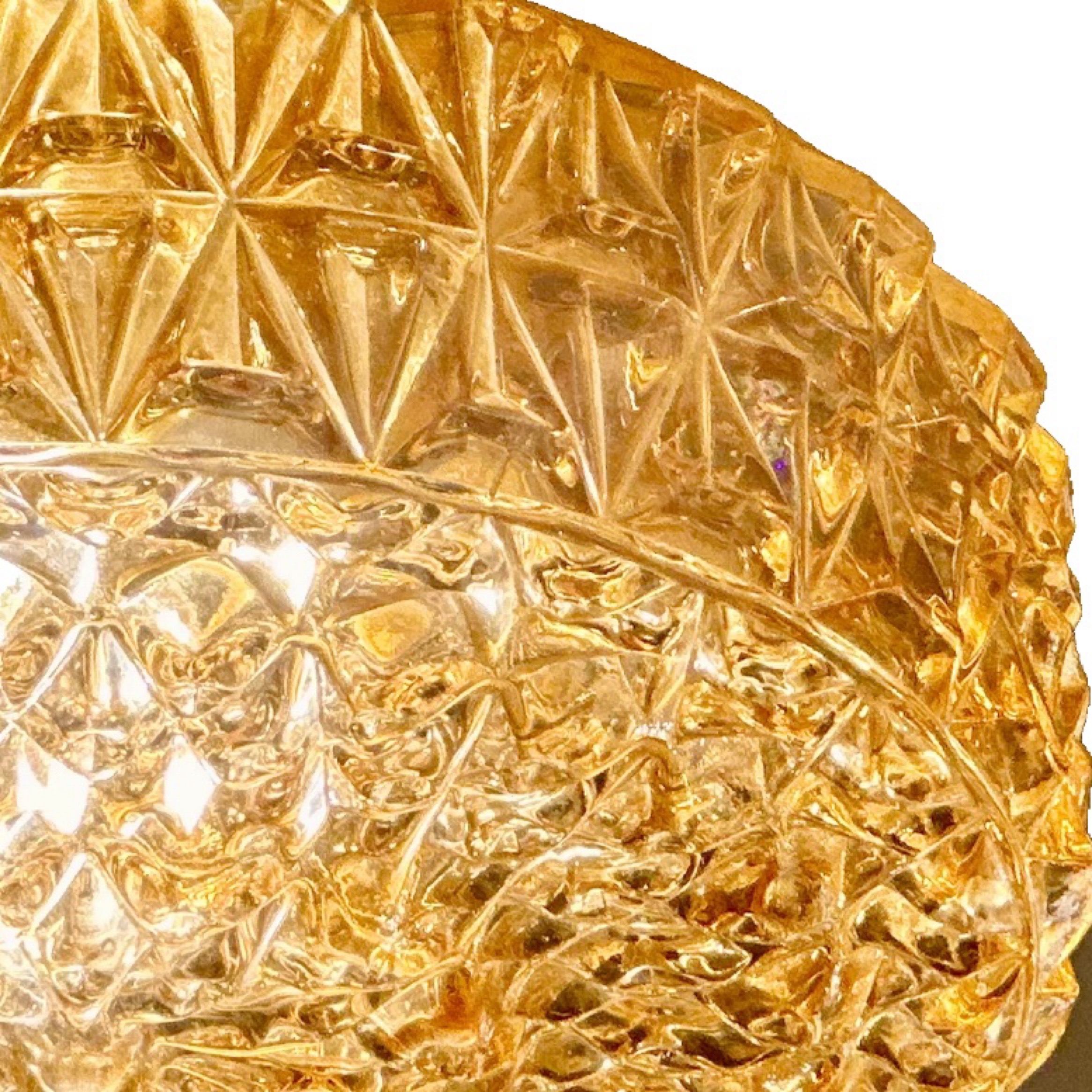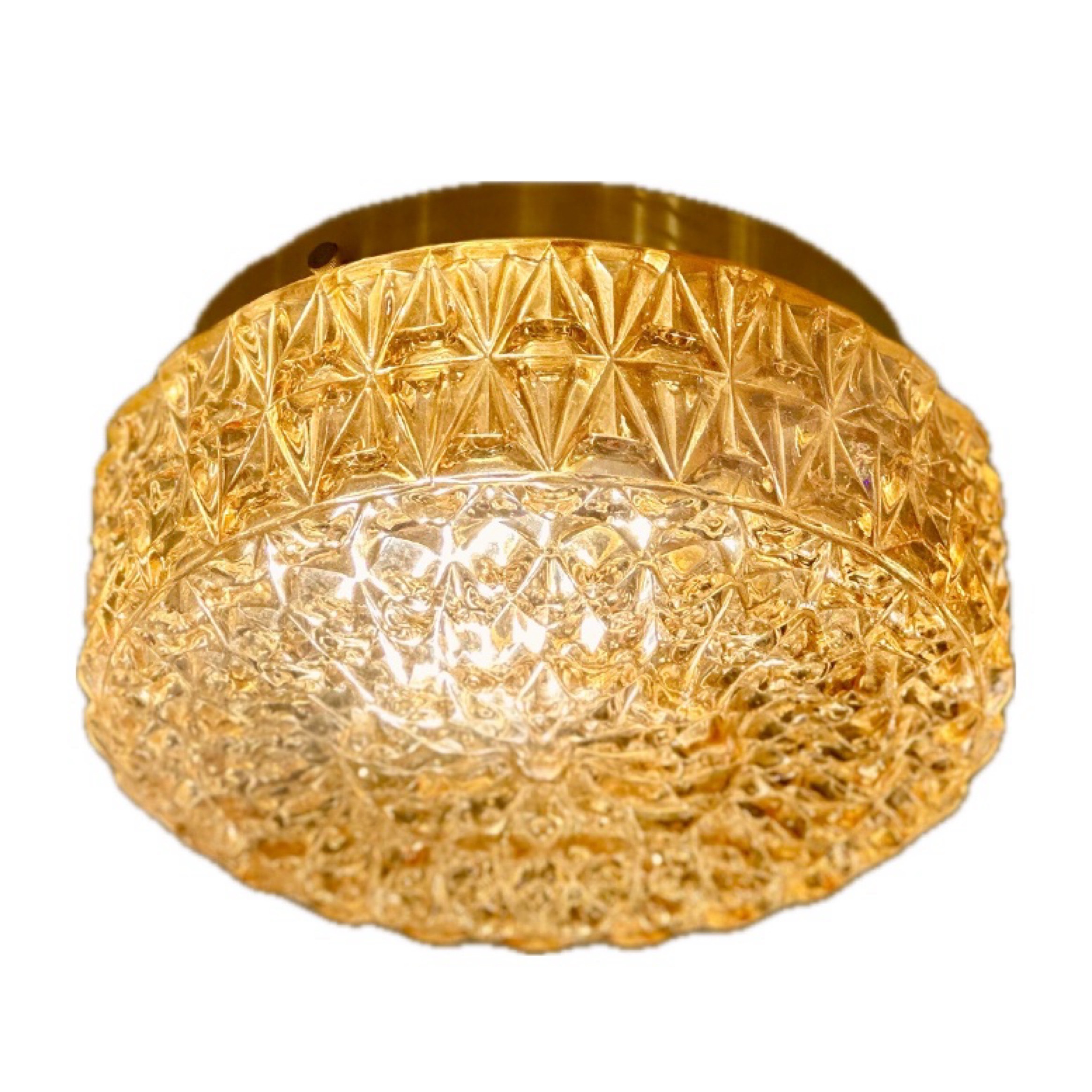 Bring timeless elegance and warmth into your space with this exquisite Kalmar-style Amber Glass Flush Mount Fixture, exclusively available at Venfield. Crafted in the refined tradition of Austrian lighting design, this flush mount ceiling fixture showcases a stunning amber glass shade with deeply textured, geometric cut patterns that catch and reflect light beautifully. The amber hue offers a rich, golden glow, creating a warm and inviting atmosphere that is ideal for both contemporary and vintage-inspired interiors. Mounted on a brass or brass-toned frame, the fixture is a perfect blend of mid-century charm and modern sophistication. With its elegant profile and timeless craftsmanship, this Kalmar-style flush mount is a true collector’s piece. Features: Attributed to Kalmar, Austria, Mid-20th Century Intricately textured amber glass Warm, diffused illumination Brass-finish flush mount base Ideal for ceiling installations in residential or boutique spaces Available exclusively at Venfield.
