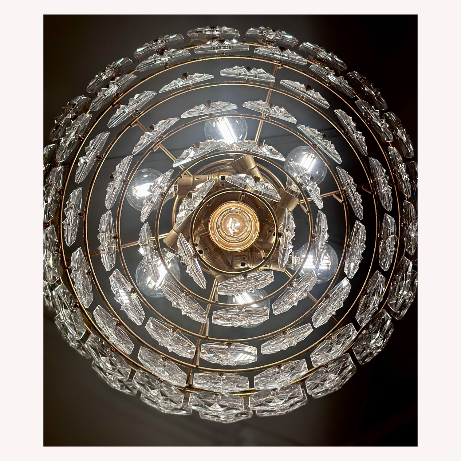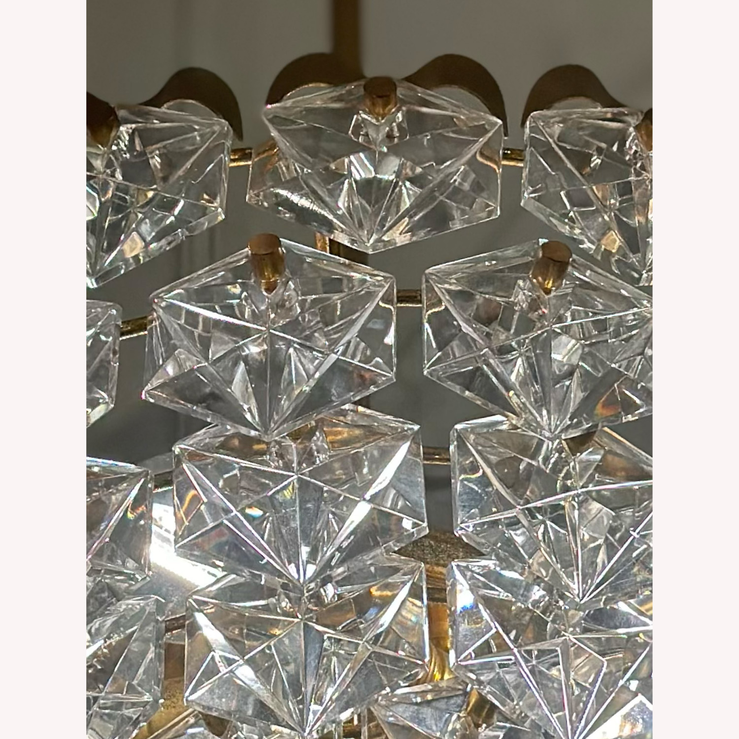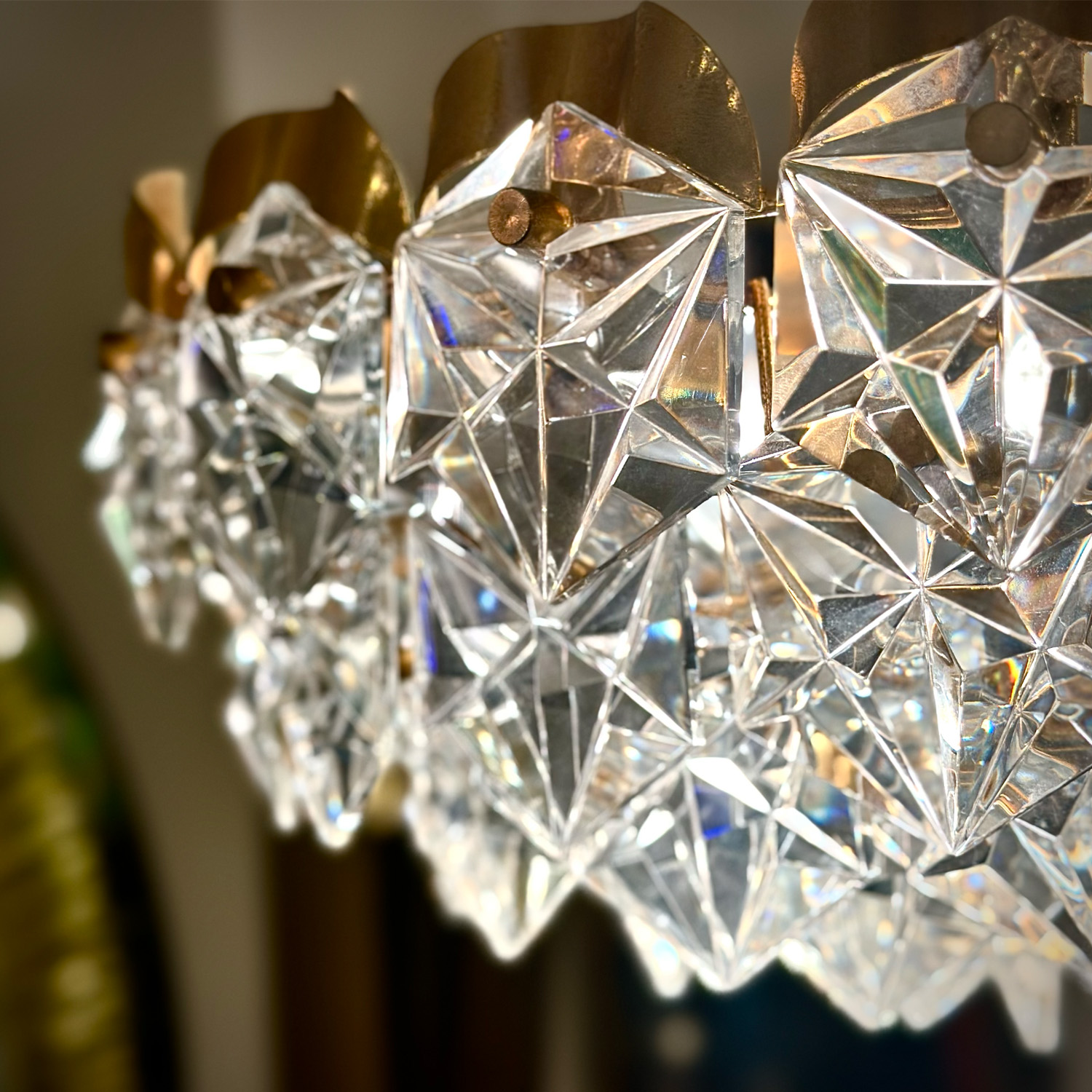Kinkeldey of Germany gained prestige and attention in 1969 after winning the IF Design Award with their prism cut crystal. This fixture, made soon after shows the same quality and craftsmanship as the winning entry. Its hexagonal crystals are meticulously cut to enhance the light eminating from seven lamps sending it radiating out in all directions. The gold tone brass body only enhances the beauty of the fixture. Kinkeldey, like Lobmeyer, Bakalowits and Limburg, is considered among the finest and highest quality in lighting.