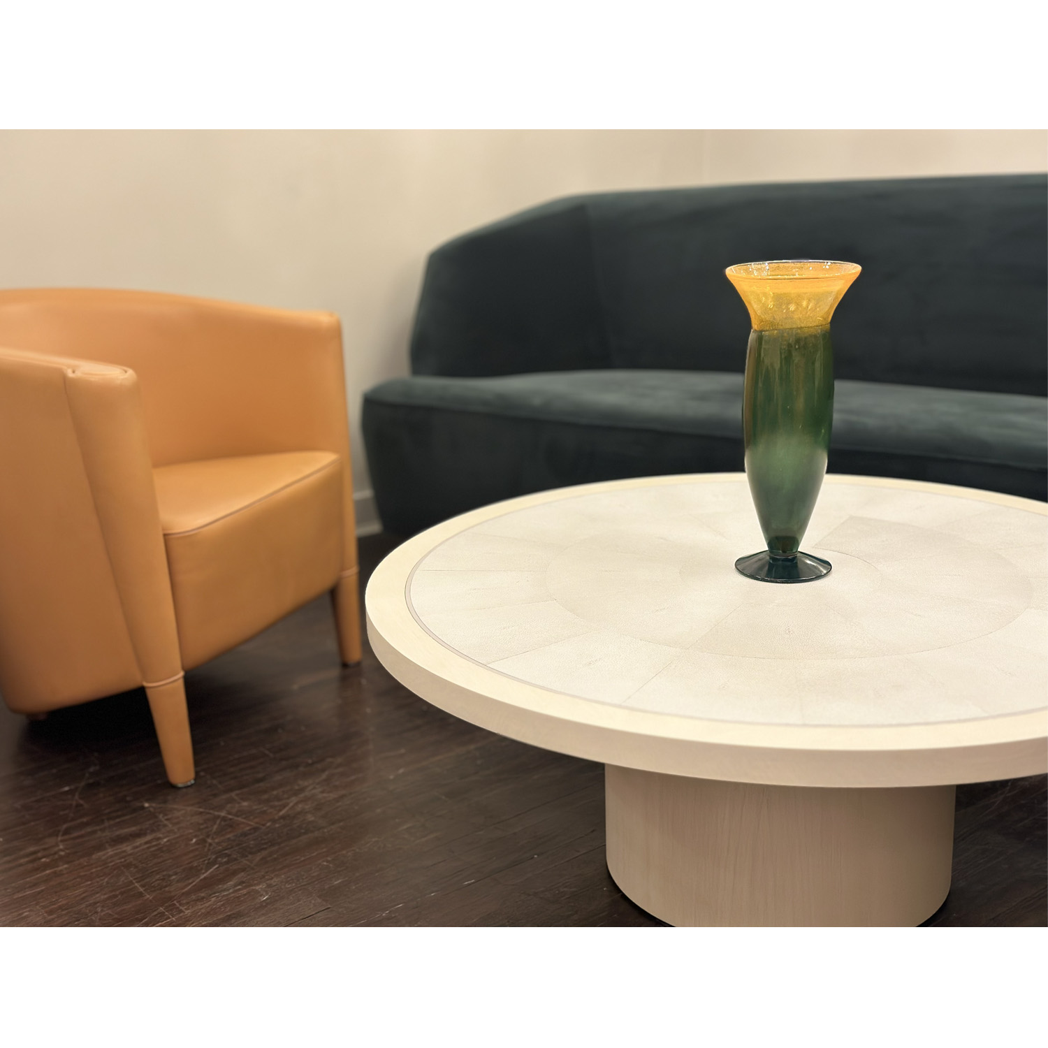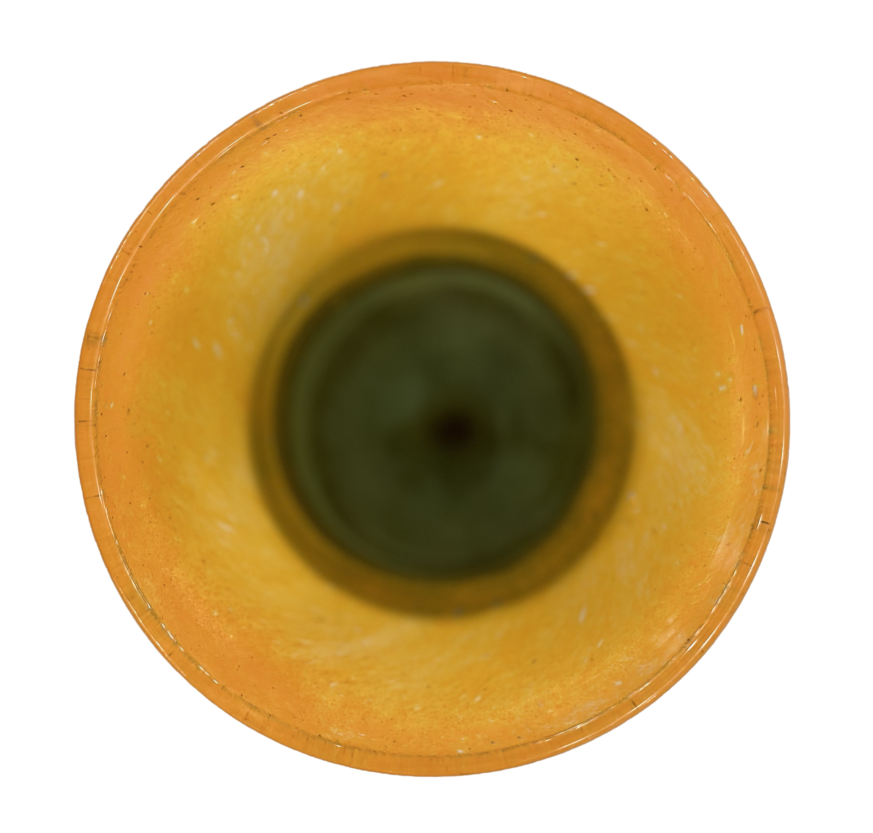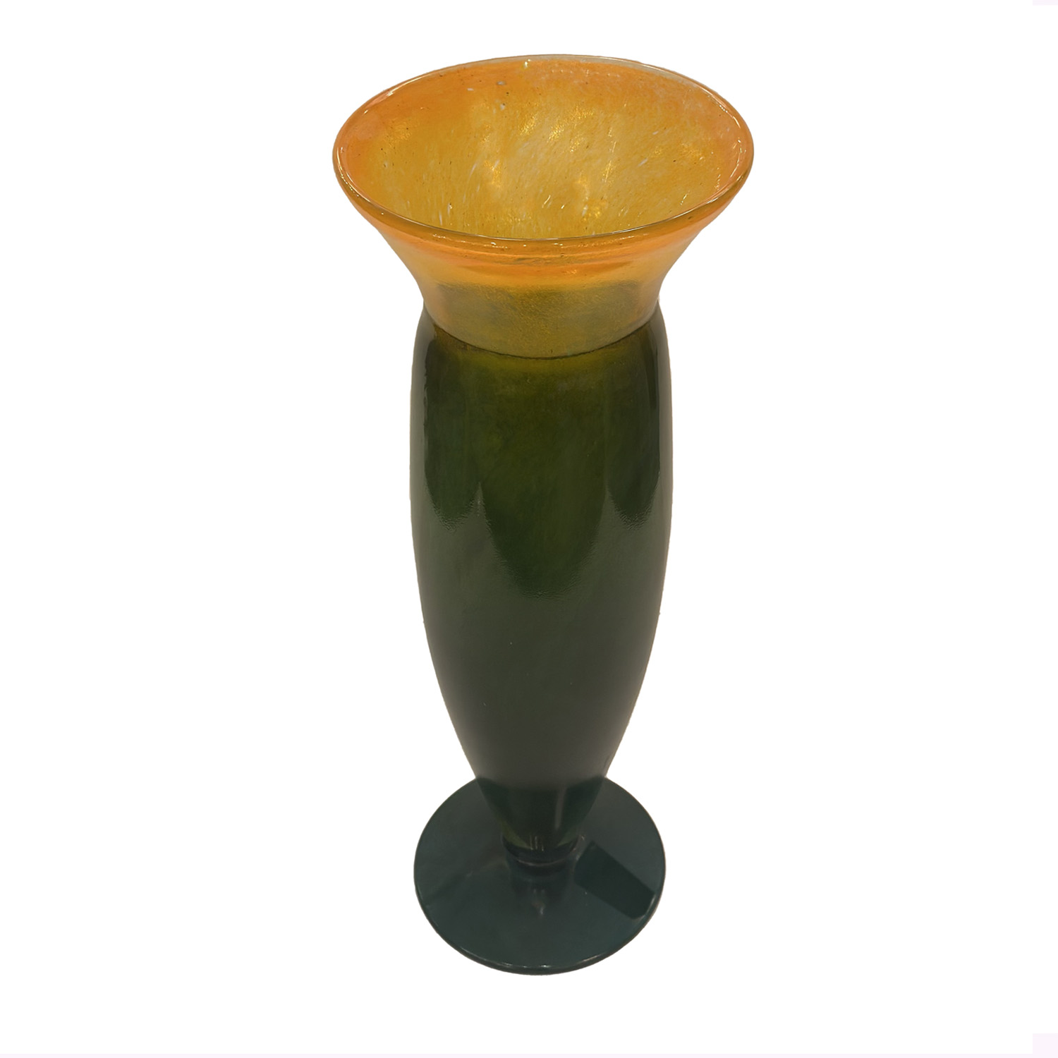Bring artistry and charm to your home decor with this brightly colored Swedish Art Glass Vase, hand crafted by glass maker Keilll Engman for renowned glass house Kosta Boda. Resembling a flowering bulb itself, the body of the vase is a dark sea green with hints of turquoise that widens to a vibrant orange lip. Whether used as a vase or simply as a stand alone decorative object, this piece will surely be noticed.