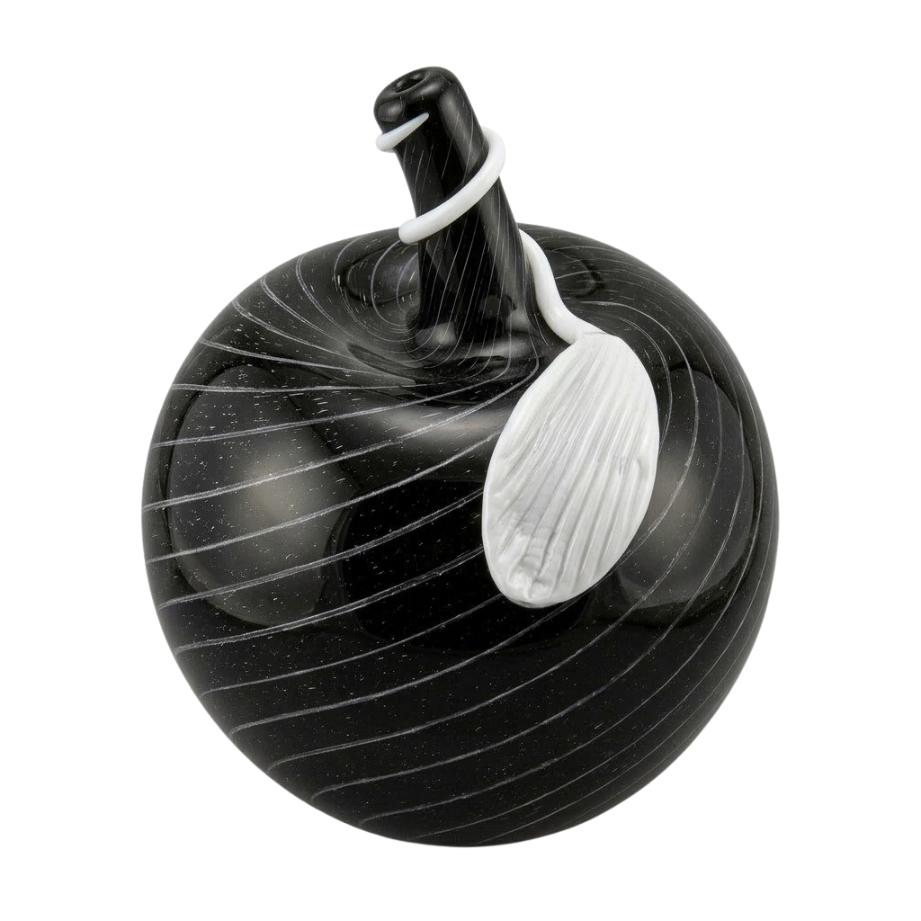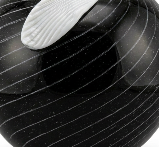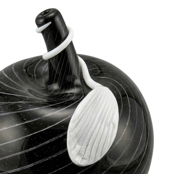 A striking example of contemporary Murano-style glass artistry, this sculptural apple-shaped vessel balances graphic precision with organic design. The rounded body, rendered in deep black glass, is enlivened by delicate white spiral pattern.