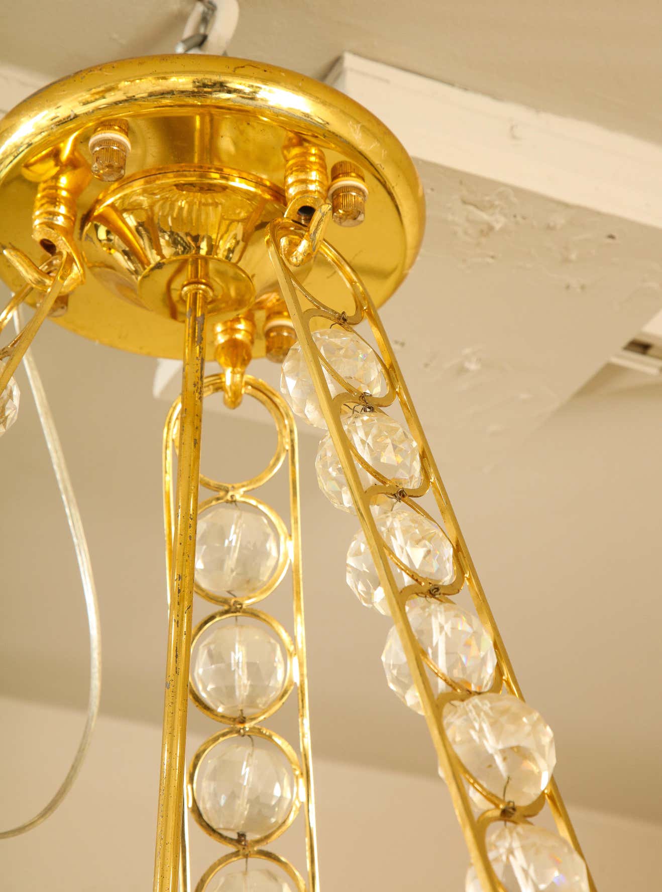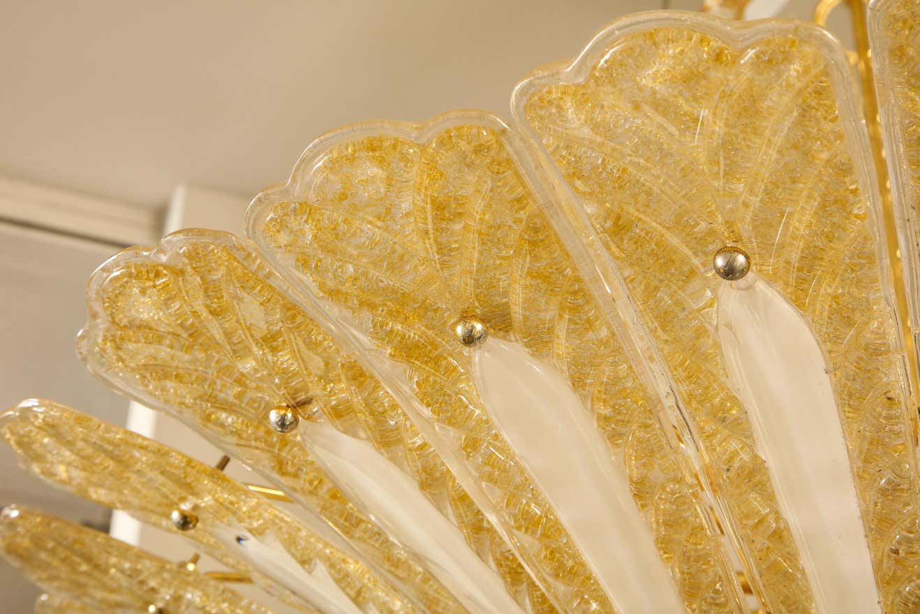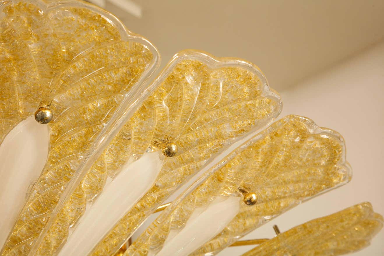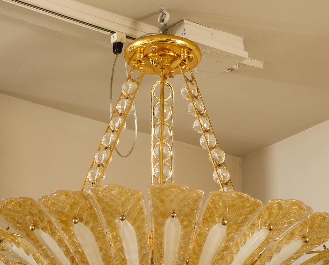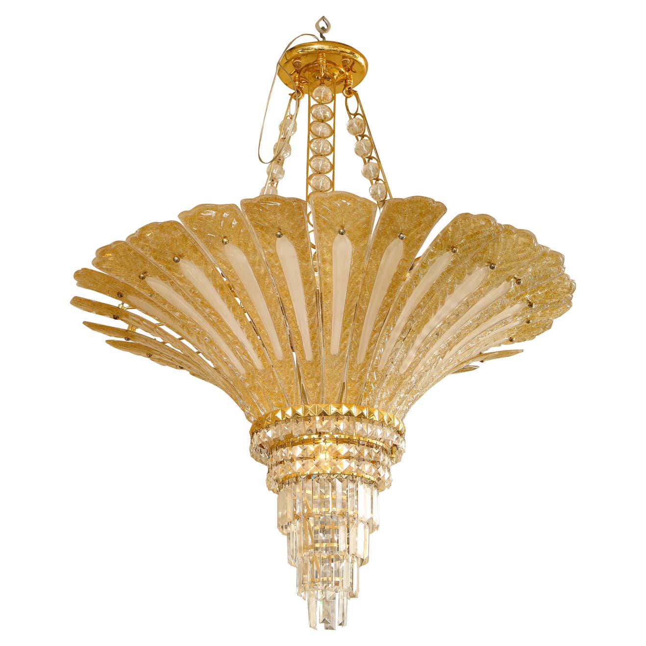 This is an impressive vintage 24-karat gold-flecked Murano glass palm tree chandelier, with faceted and cut baguette crystals hanging at the end of the chandelier. The structure is made of brass, plated in 24-karat gold and, uniquely suspended by the 3 arms with faceted crystal spheres. It has 19 of E27 (standard base) sockets to illuminate. It is an outstanding chandelier that will add a touch of radiance, glamour, and luxury to the main room in your home. The chandelier is attributed to Barovier E Toso.