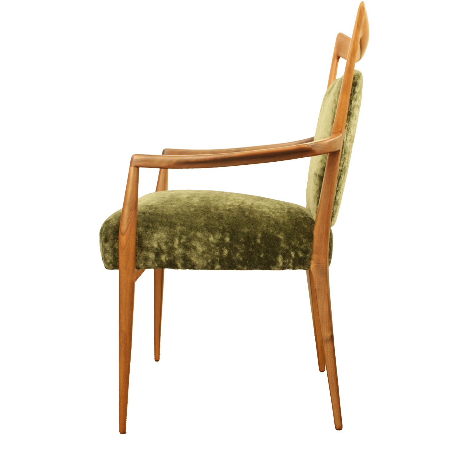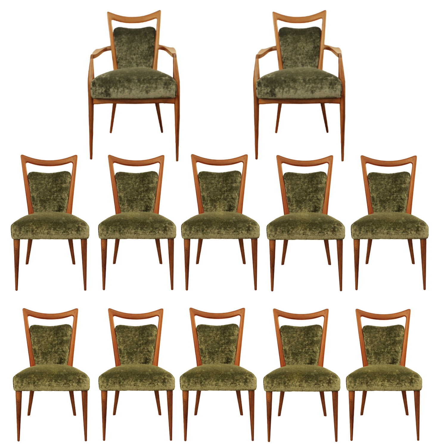 Stunning Set of 12 mid-century modern dining chairs (2 Arm and 10 Side) in walnut, upholstered in lush forest green crushed linen velvet by Holly Hunt. This large ensemble of dining chairs has been refinished and reupholstered by Venfield and is in pristine The well known "Zig Zag" silhouette and iconic design are by Melchiorre Bega. Italy, 1950's. Currently in our NYC showroom Widt Dept. Dept. Seat. Seat.