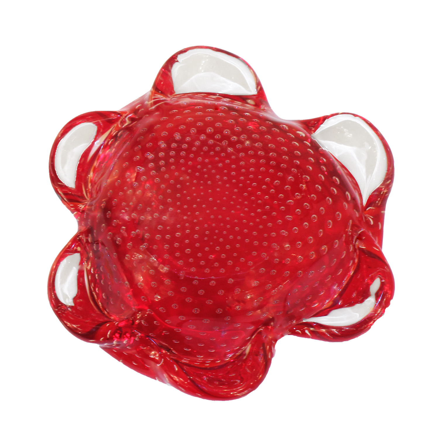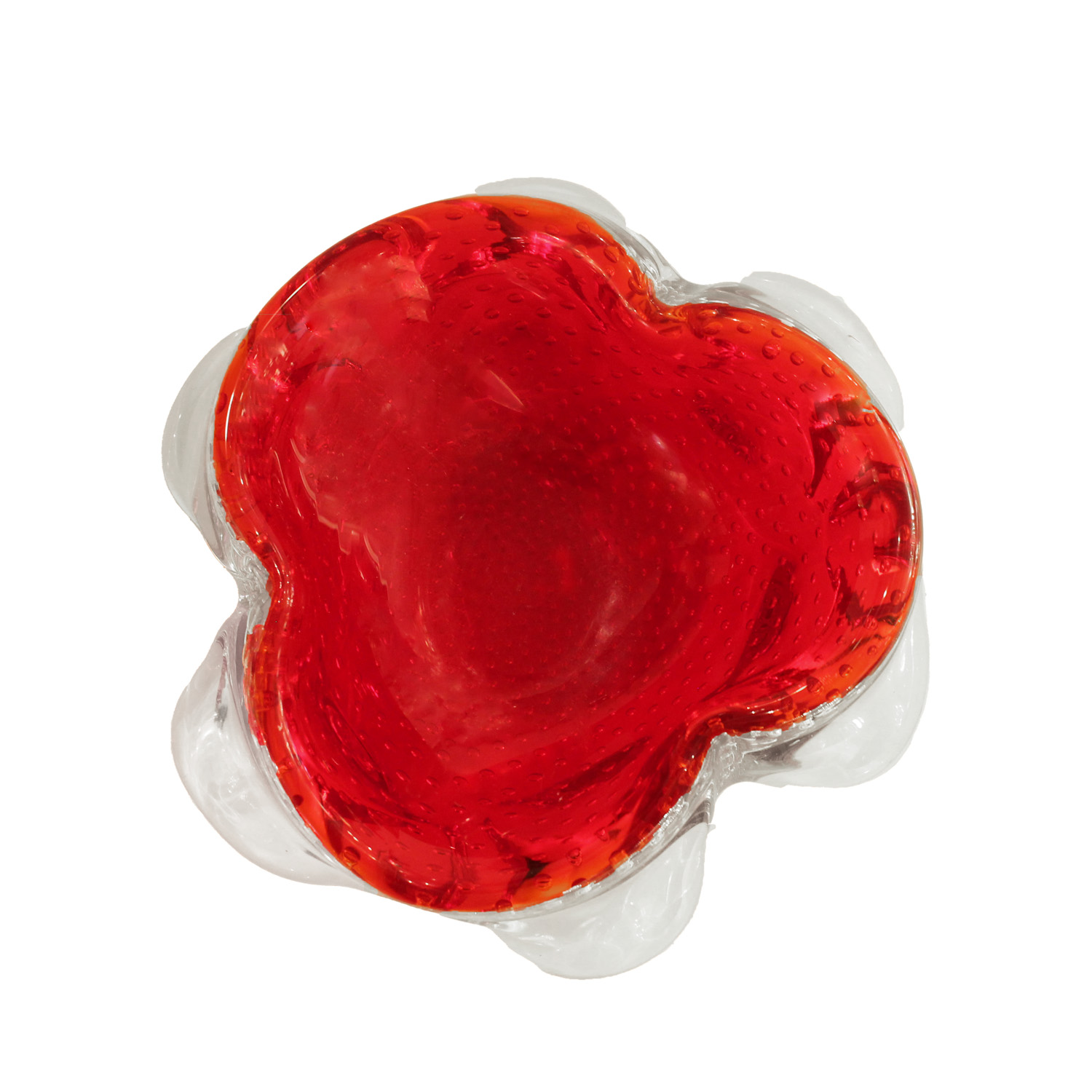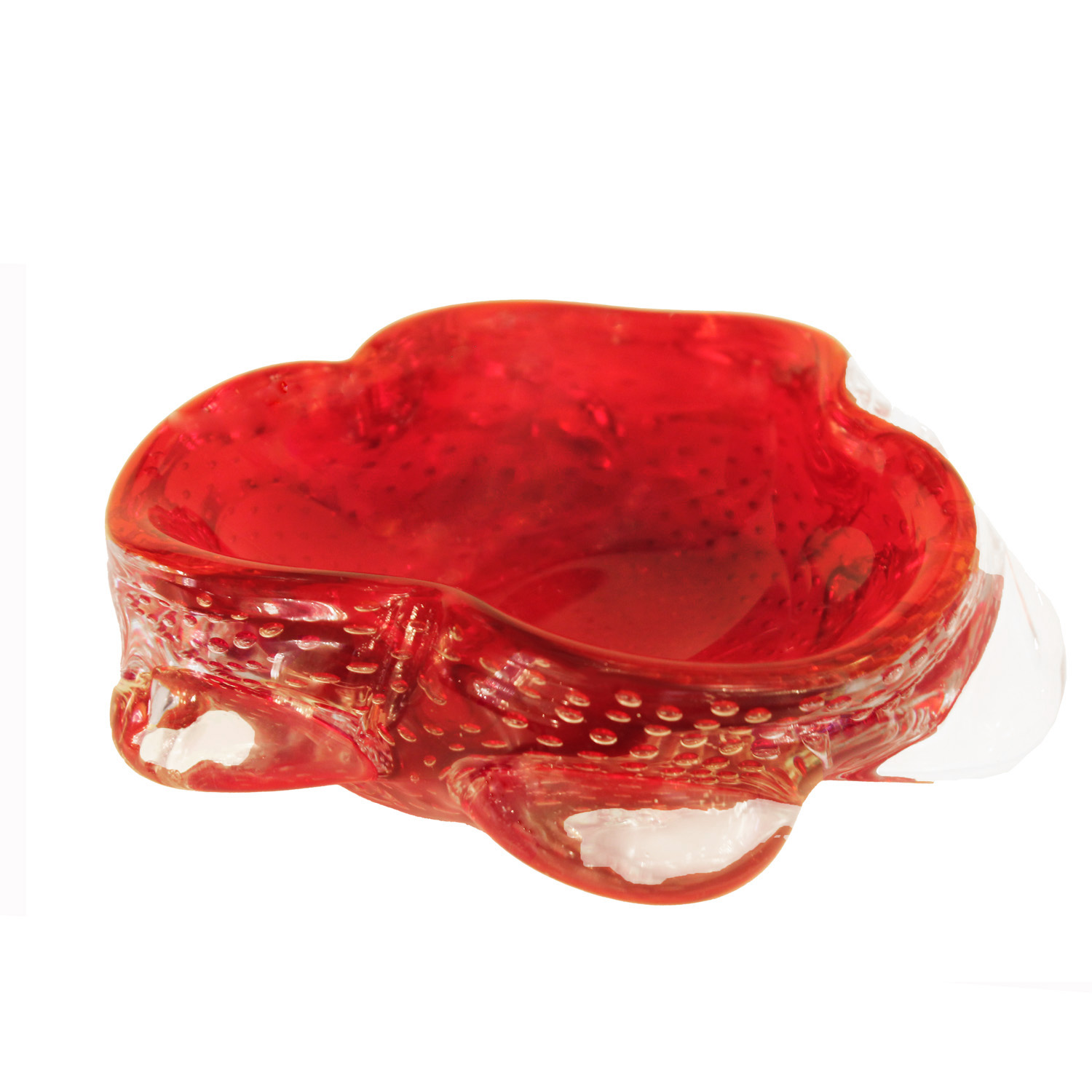 Murano red and clear art glass bowl with controlled bullicante and applied clear glass forms surrounding sides. Italian Mid-Century.