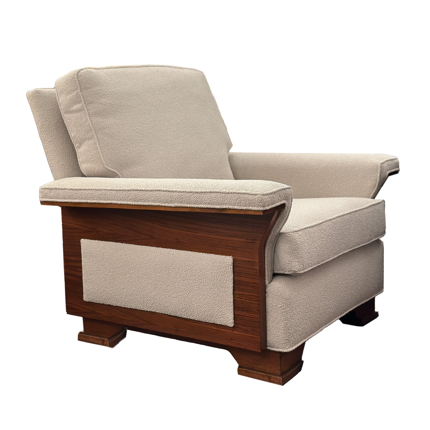 Combining comfort and charm, the plush boucle upholstery and clean lines of these paneled Mid-Century Modern arm chairs balance a sense of relaxation and sophistication, while dark wood accents add timeless elegance and appeal. Designed with generously proportioned arms that complement their sturdy frame and thick cushioning, they're an inviting and luxurious addition to any contemporary interior.