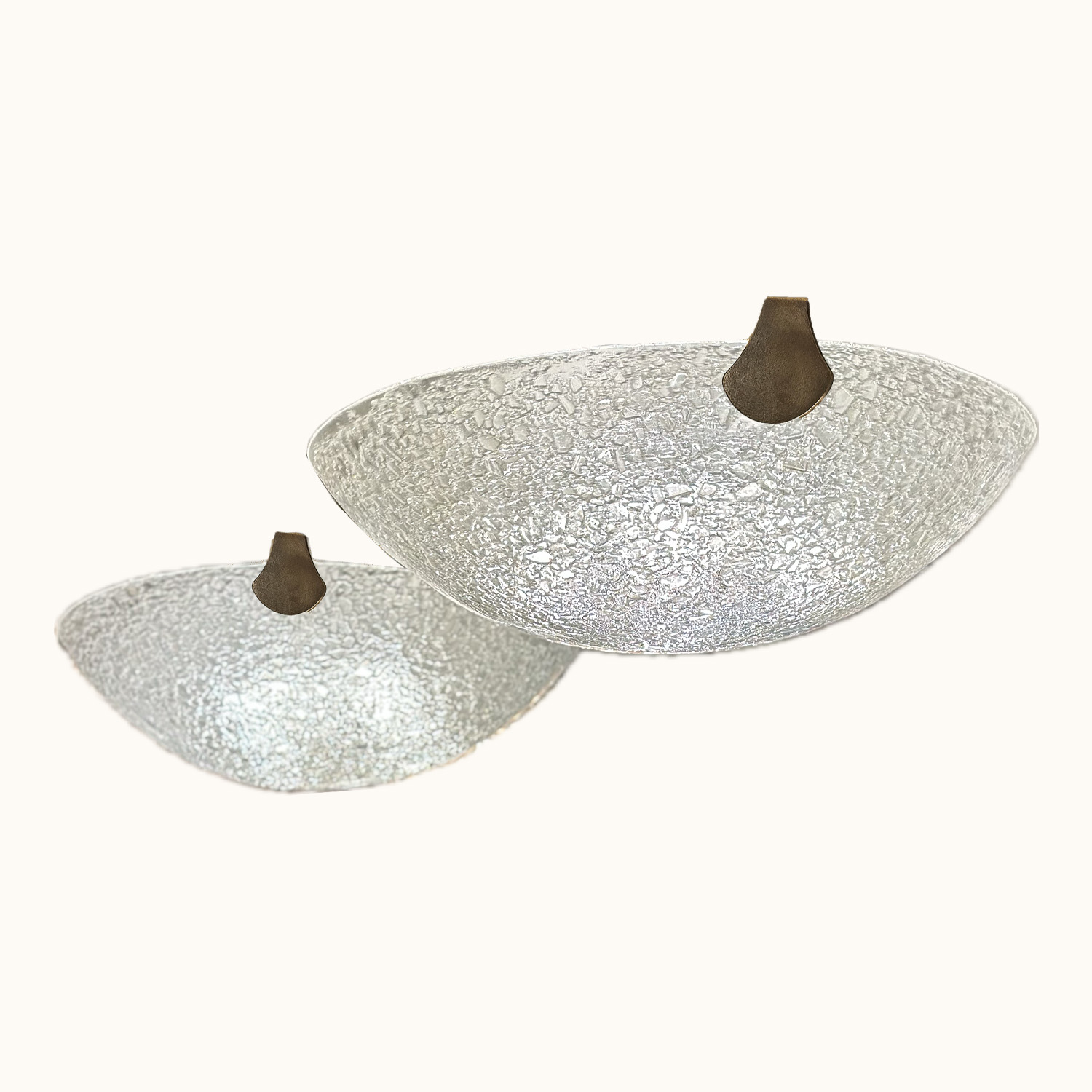 Sleek and modern, the minimalist design of these flush mount ceiling fixtures makes them suitable for contemporary interior space. A smoooth outside surface is given visual texture by the addition of fritted glass that coats the convex side of the fixture. The fixtures are suspended by simple supports that compliment their contemporary aesthetic. Sold as a pair or separately and priced individually.