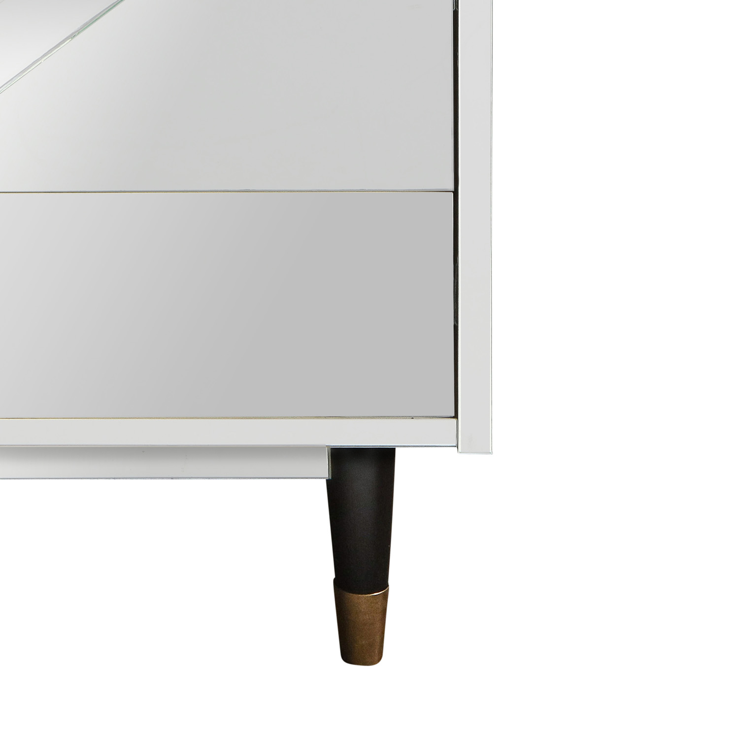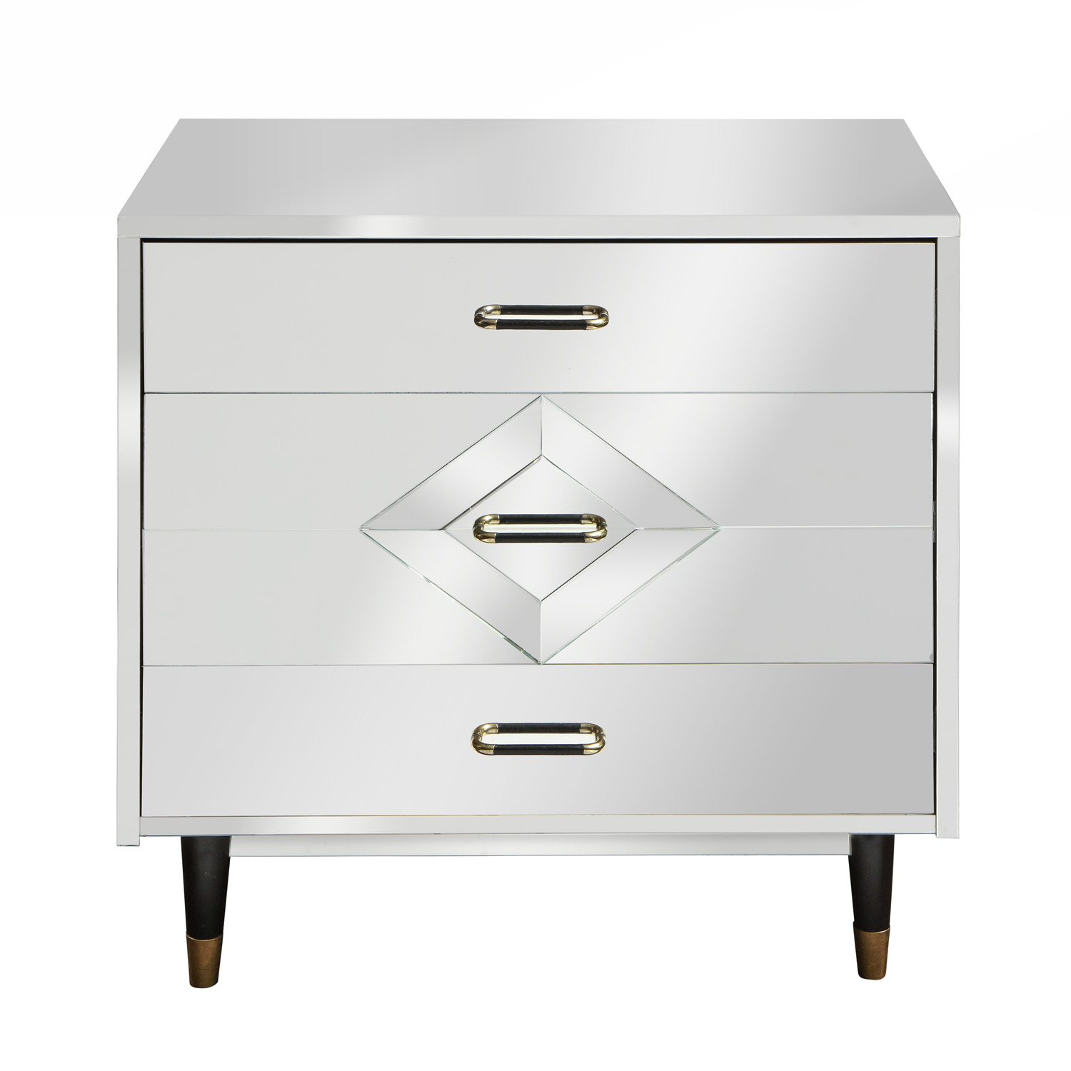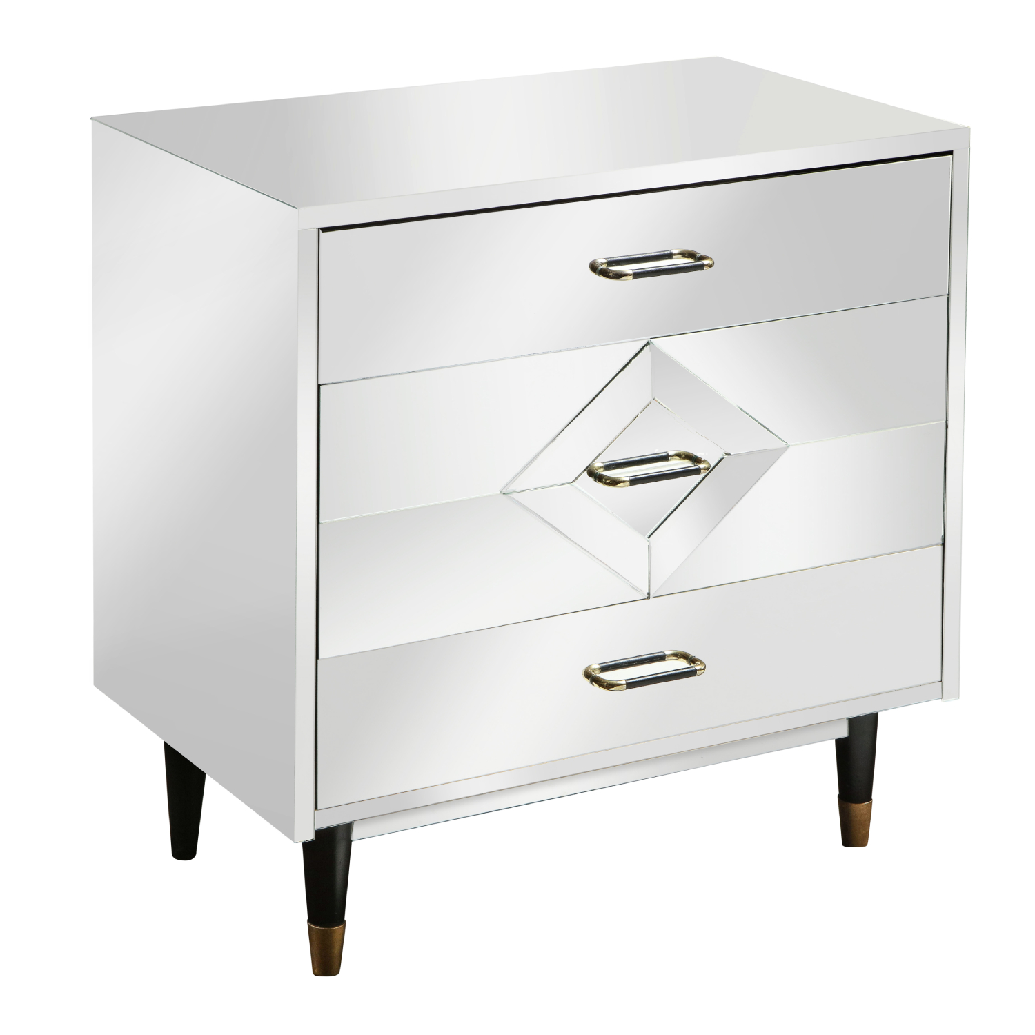 Single mirrored 3-drawer chest with diamond front accent on the center drawer and black satin lacquered legs with brass sabots. Top and bottom drawers are 6" deep in The center drawer is 10-3/4".