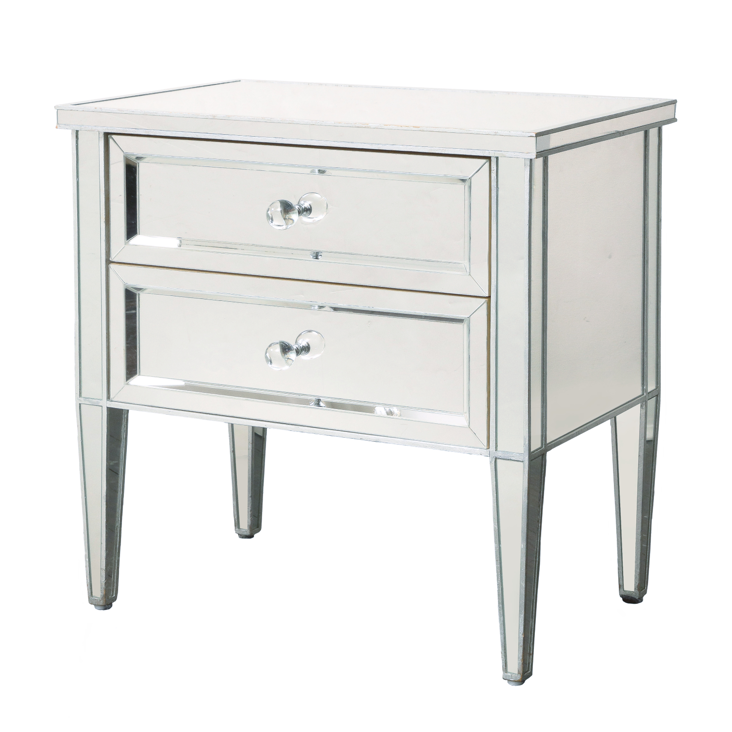 Chic pair of Neoclassical style mirrored nightstands with painted silver trim and crystal ball knobs. All drawers are 19" wide an deep in The interior is finished in maple. Desgined by Venfield. The pair is currently available as shown in our NYC showroom as well as a matching highboy dresser. Custom orders are also available. Please inquire with Venfield for more information.