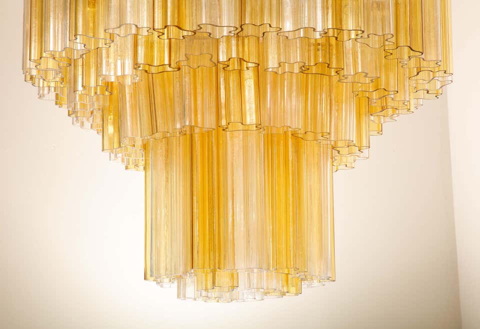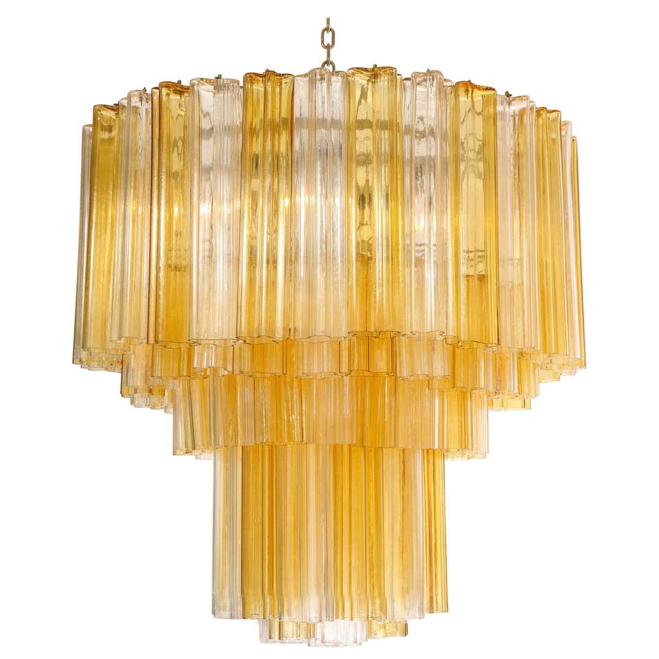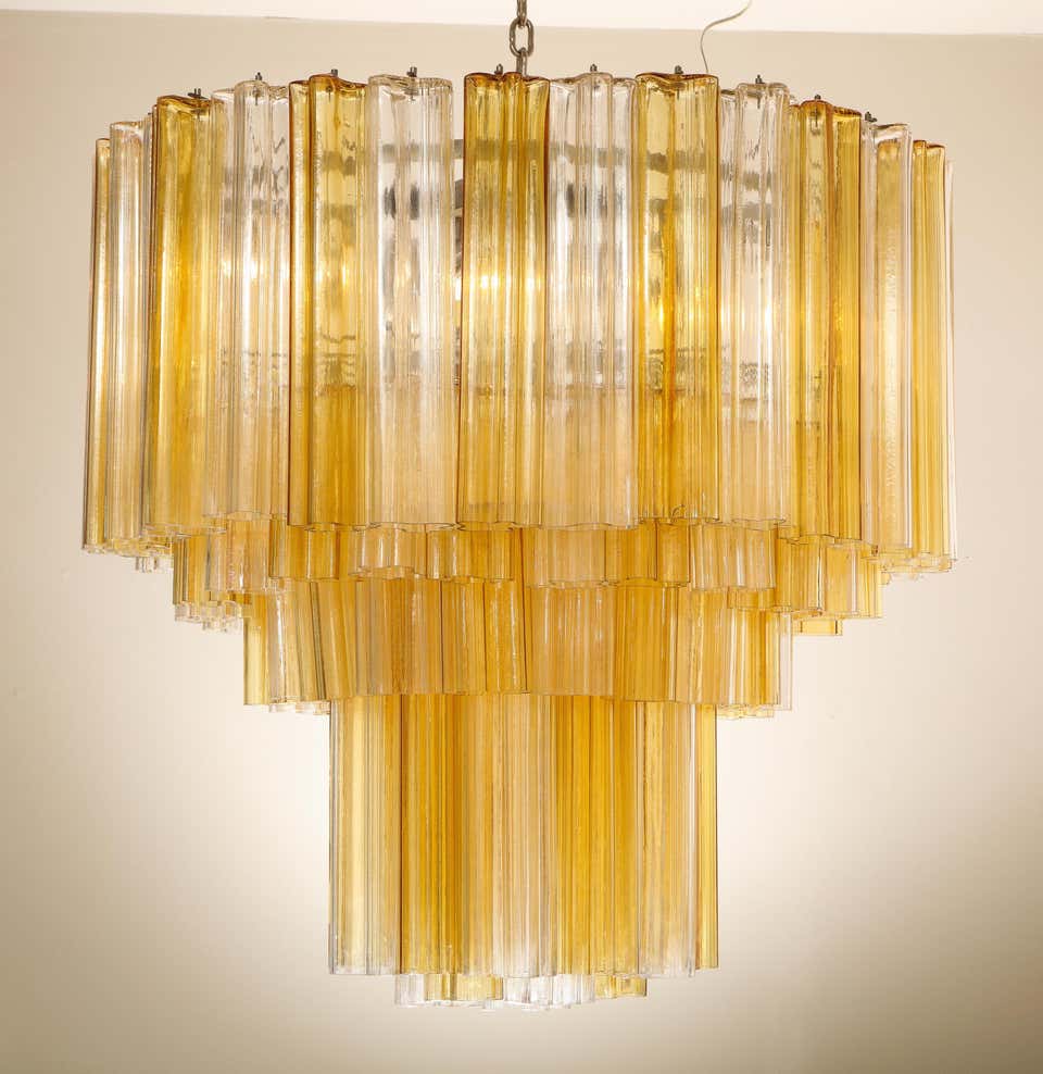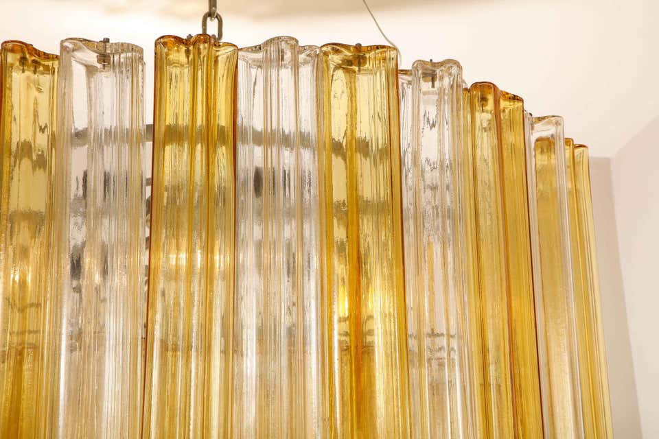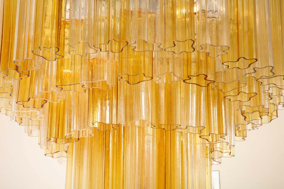 Monumental Venini tiered clear and amber Tronchi glass chandelier. Few glass pieces have minor There are 20 sockets total.