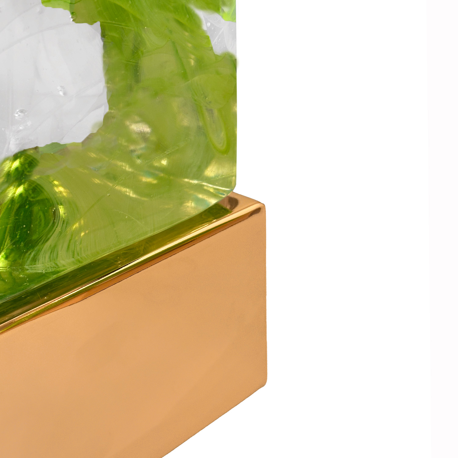 A modern take on a traditional method. This artisinal pair of clear Murano glass block lamps contain a frenetic abstract swirl of vibrant green sommerso glass set against a polished brass body. Also available in swirls of red, blue, yellow and magenta by special order. This pair is currently displayed and available in our New York City Showroom. Lampshades not available. 75 iinches (to top of socket).