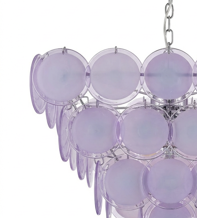 Stunning mid-century Murano glass disc chandelier. Suspended from a polished chrome canopy and chain, the fixture is composed of 52 discs arranged in 4 layered rows. Each of the circular discs is hand-blown and comes in a soft, luminous lavender hue.