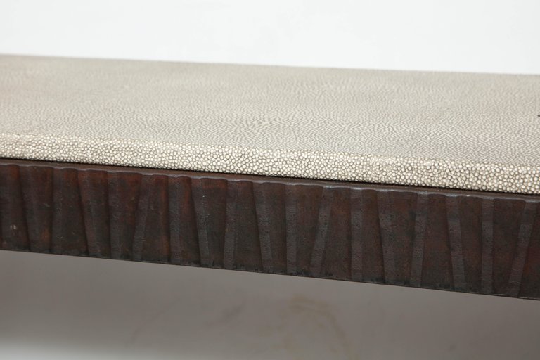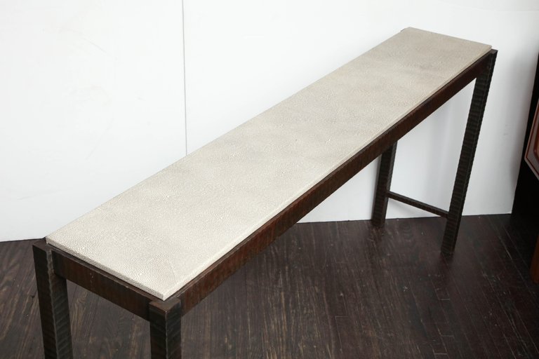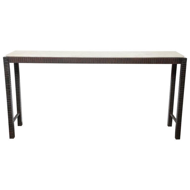 Custom ostrich embossed Edelman leather console with hand forged patinated steel base and leather wrapped drop in top. Customization is available in different sizes and leathers/fabrics.