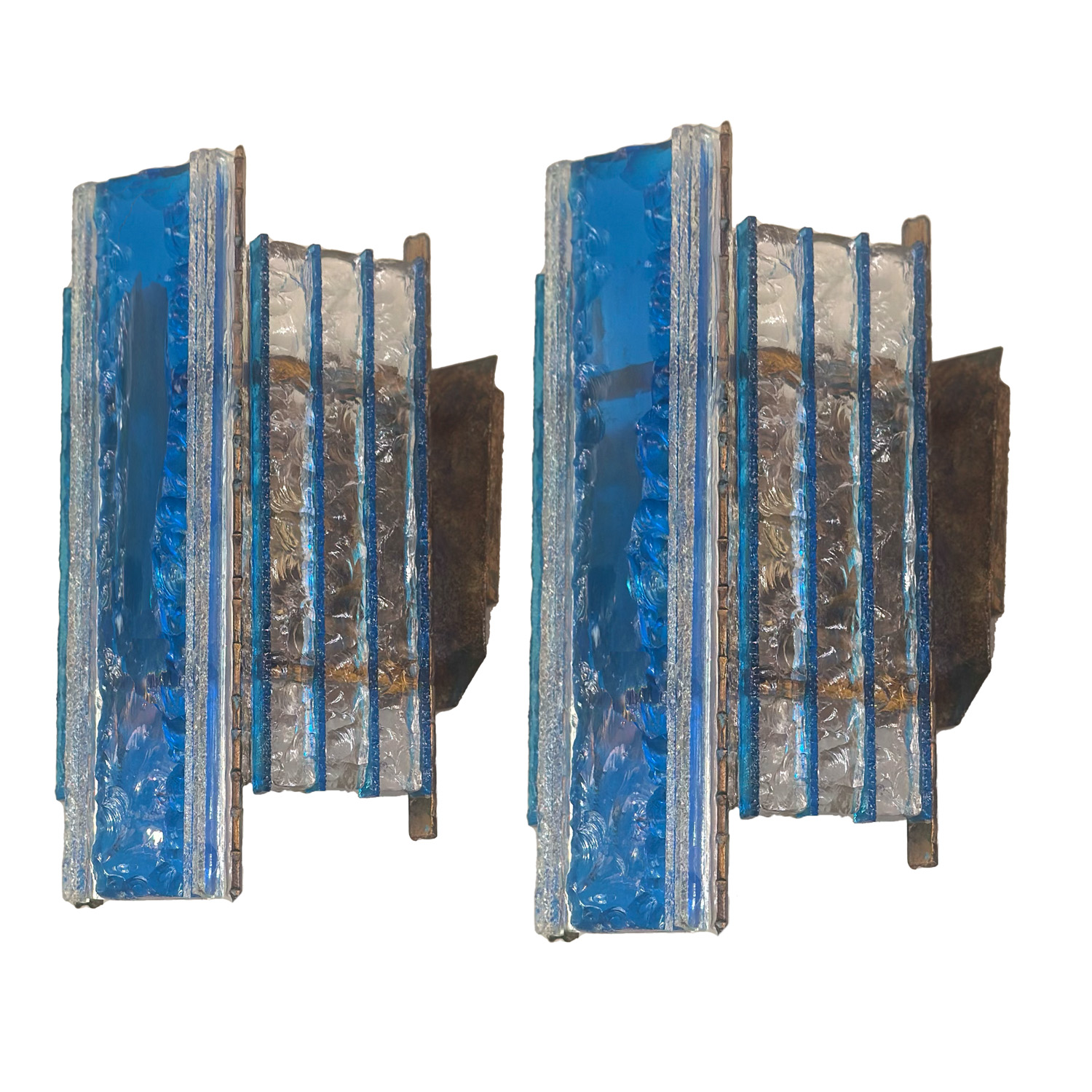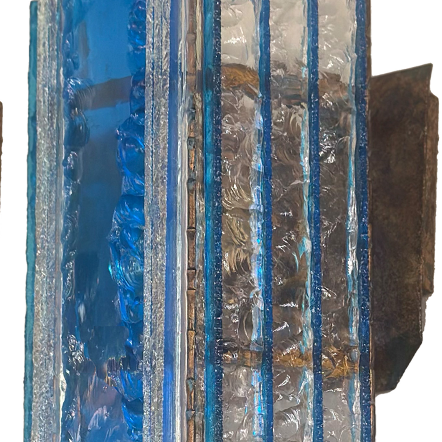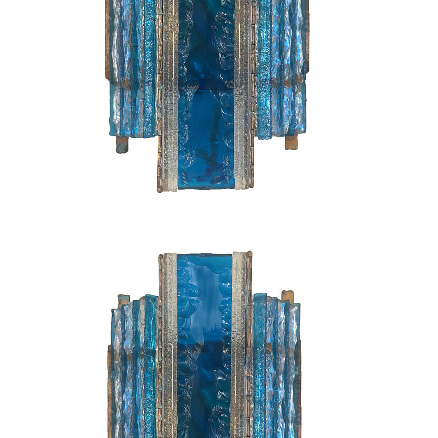 This pair of blue and cler hammered Murano glass sconses highlight's Longobard’s guiding principle that lighting designs be visually stunning and practical, an approach that not only illuminated spaces but enhanceed their aesthetic appeal as well. These and several other Longobard lighting creations are now available at Venfield's NYC showroom.