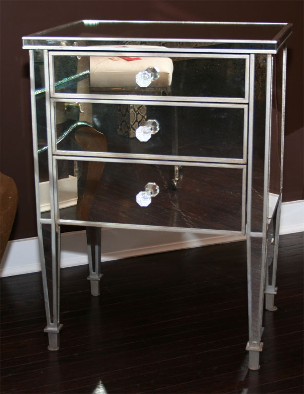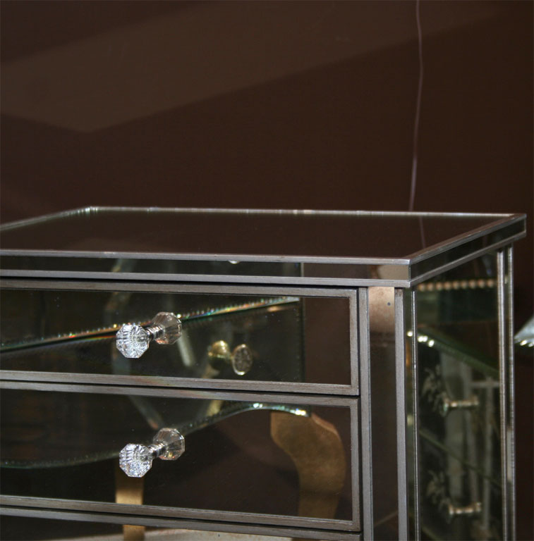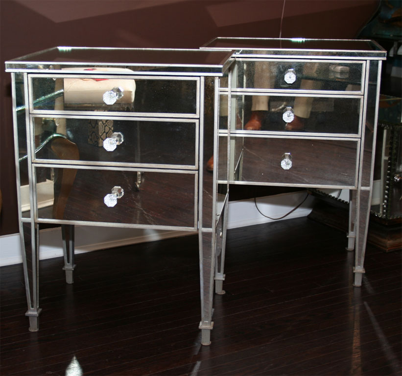 Pair of custom 3-drawer silver trim mirrored nightstands. Customization is available in different sizes and finishes.