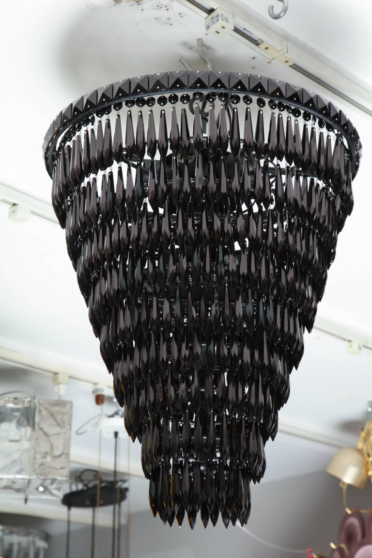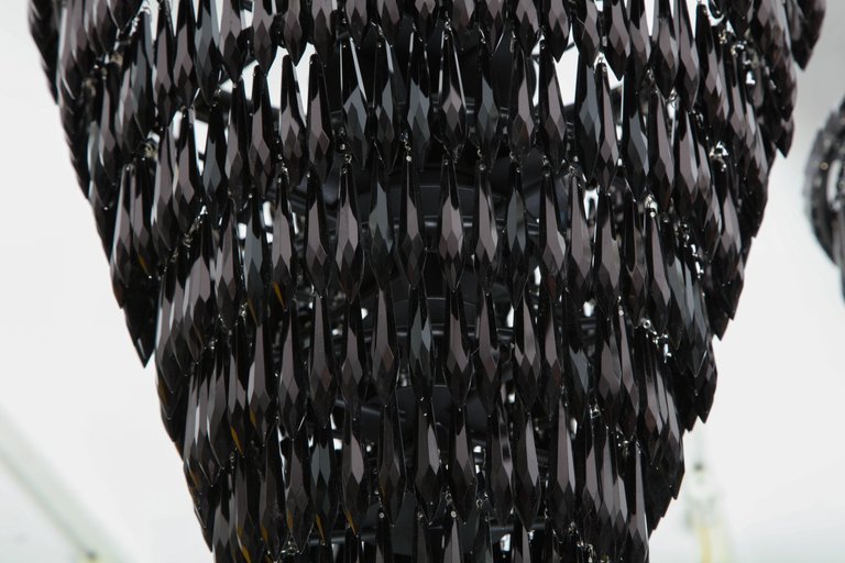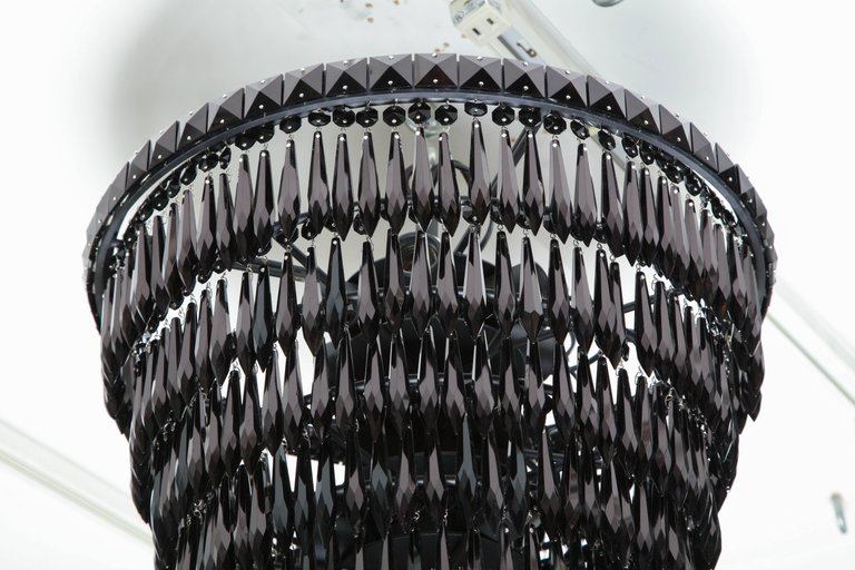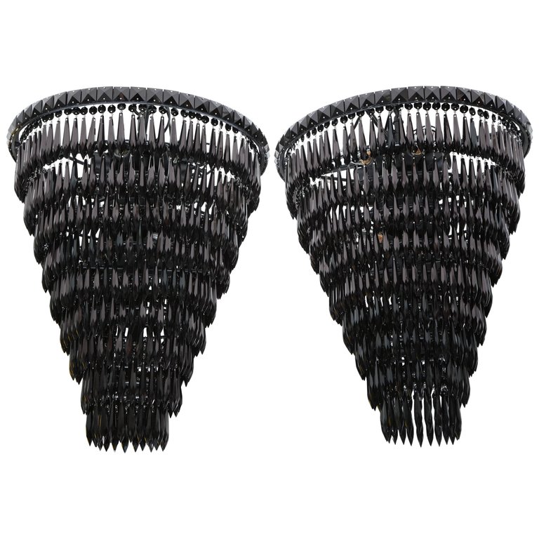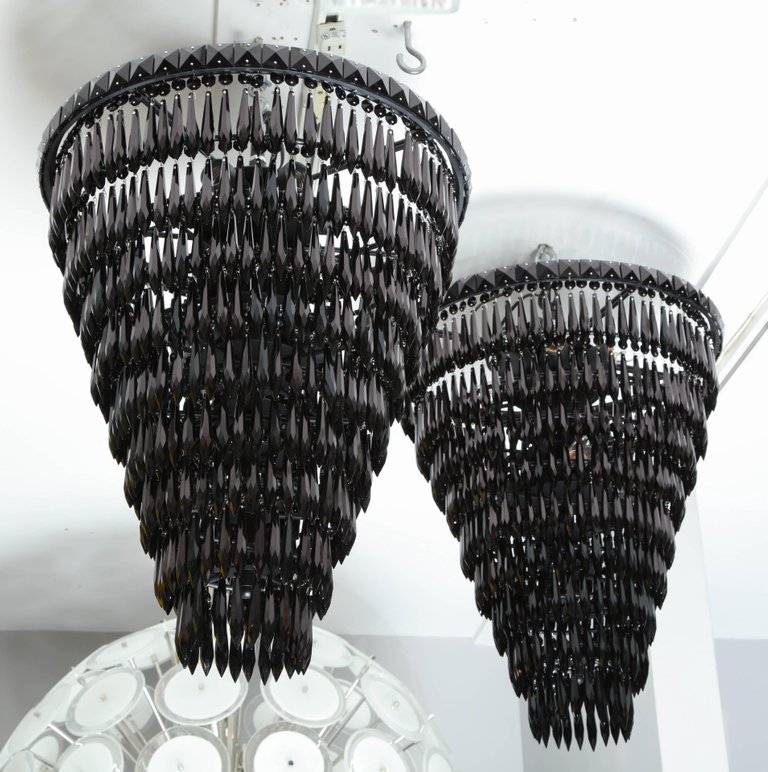 Pair of custom black fringe crystal pendants. Customization is available in different sizes, finishes and colors.