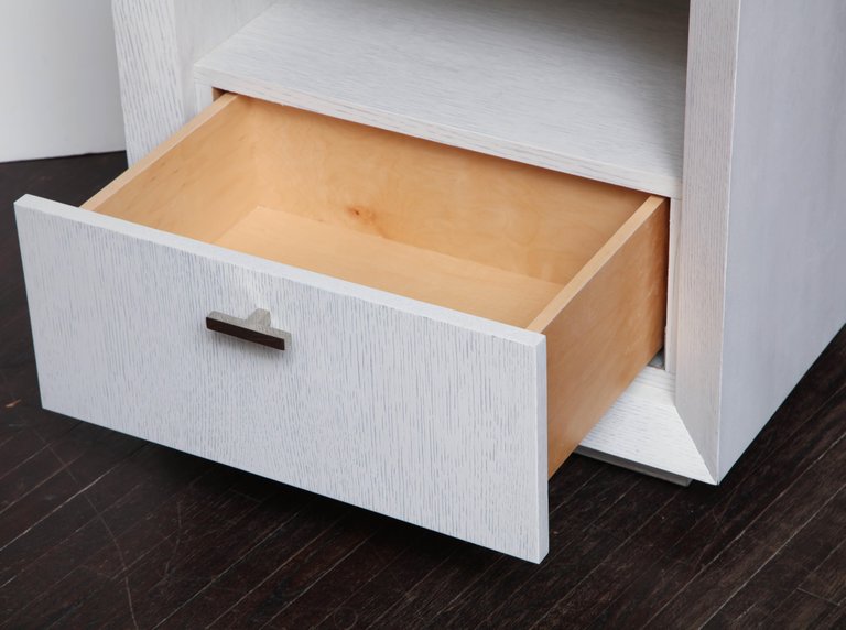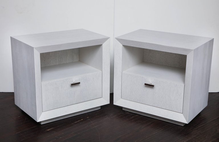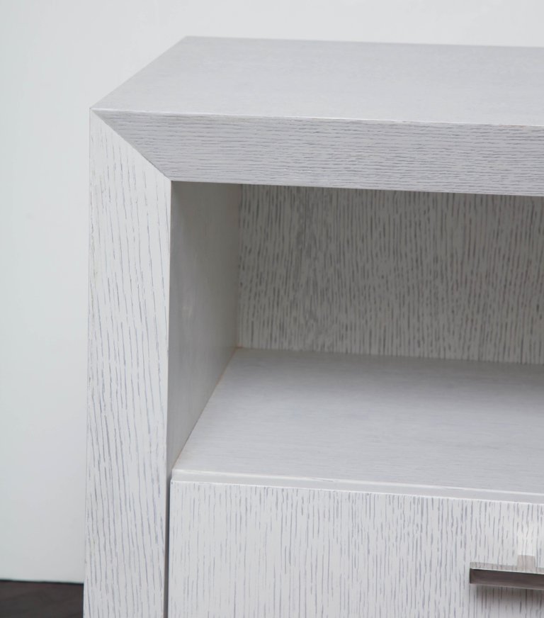 Pair of custom painted cerused wood nightstands with polished nickel pull. The drawer interior finish is shown in maple. Customization is available in different sizes, colors, interior finish, and hardware (Customer Owned Hardware).