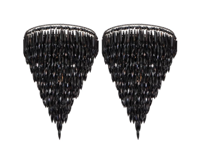 About Pair of elegant black crystal fringe sconces. Details CREATOR Venfield (Manufacturer) PRODUCTION TYPE Current Production PRODUCTION TIME Available Now OF THE PERIOD Modern PLACE OF ORIGIN United States DATE OF MANUFACTURE 2010 PERIOD 21st Century MATERIALS AND TECHNIQUES BeadedCrystal, Metal Wx7 in. 48 cmHx36 cmWx18 cmD SELLER LOCATION New York, NY SELLER REFERENCE NUMBER L7073.