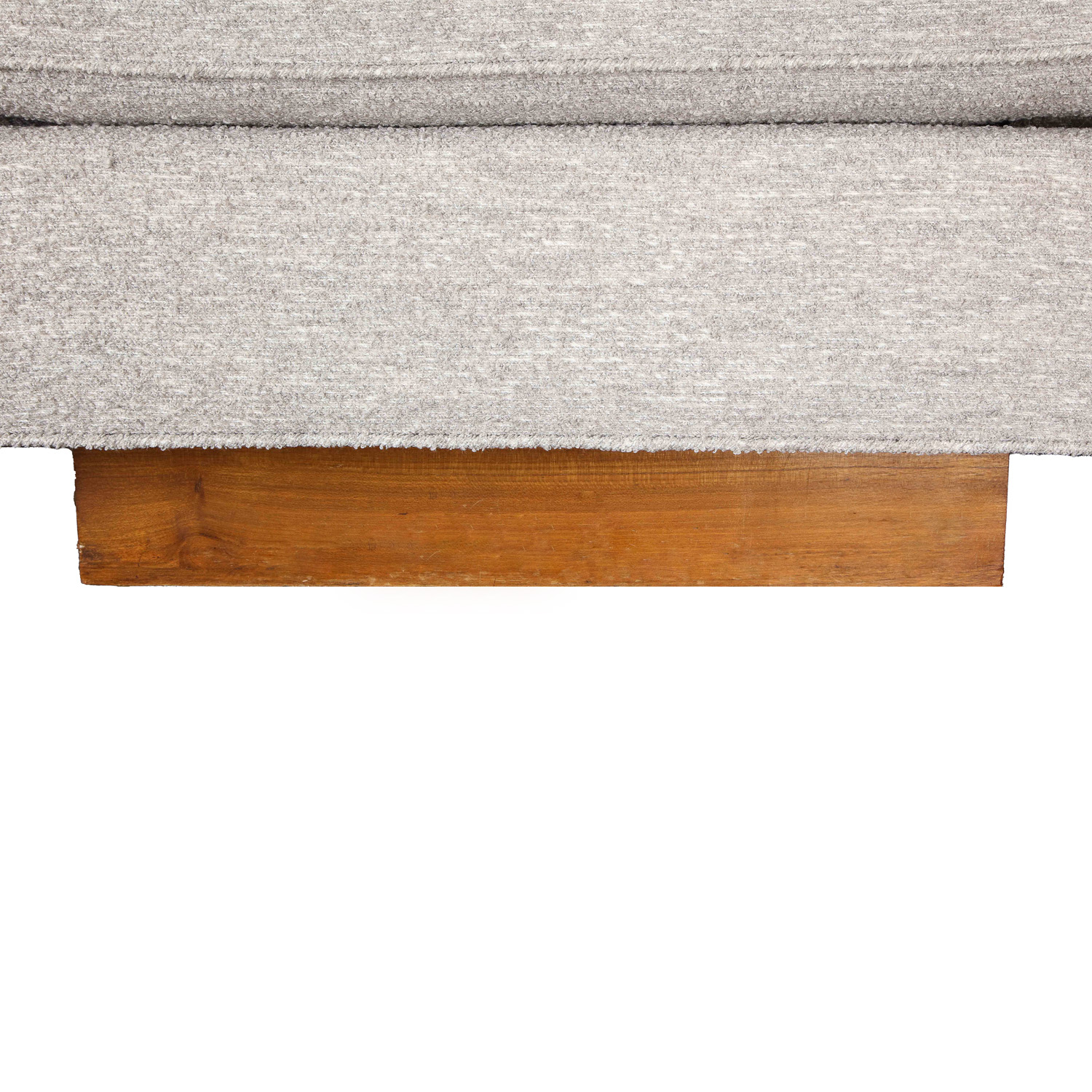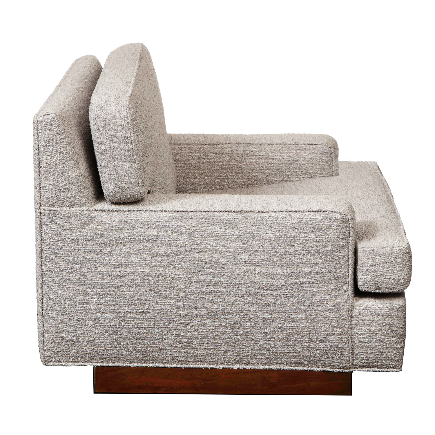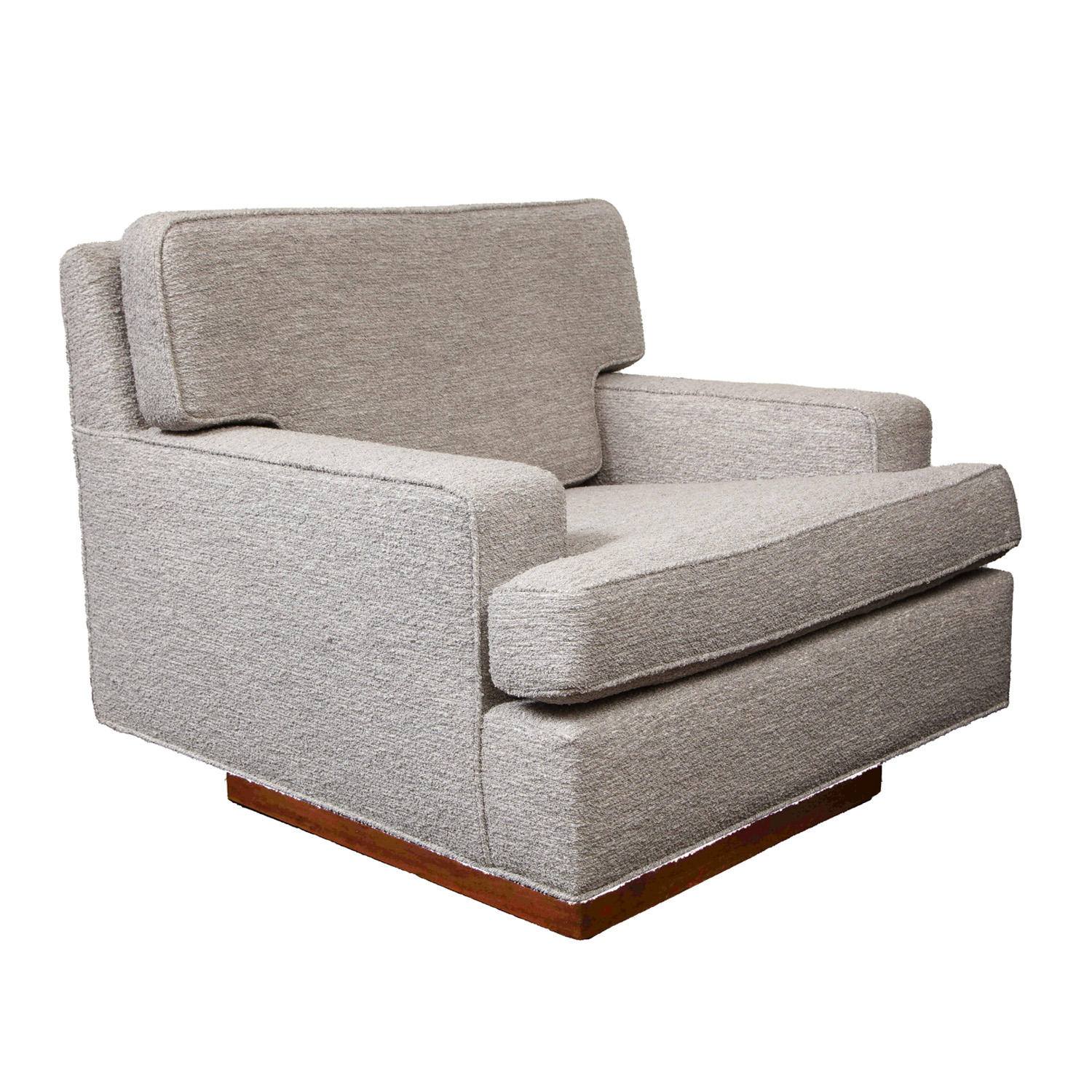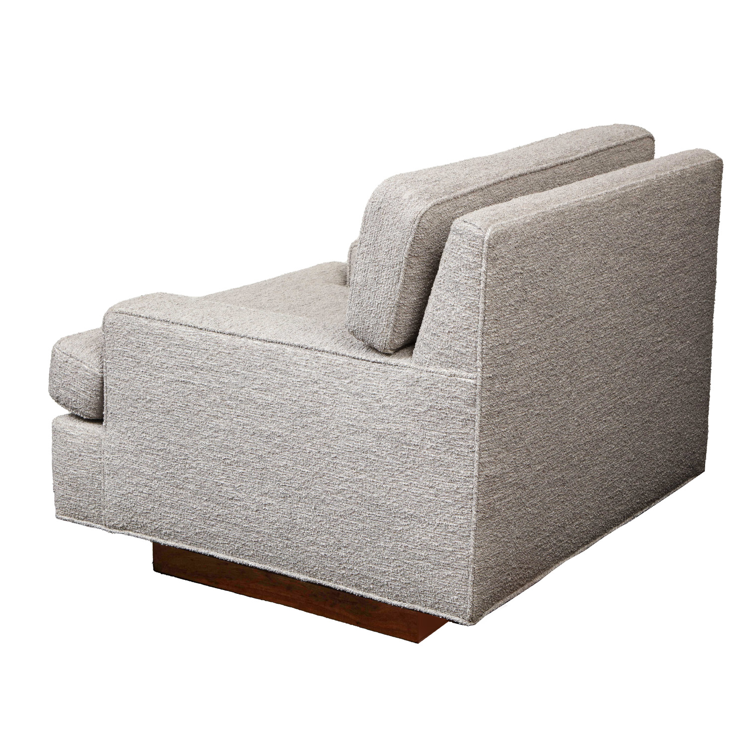 Chic pair of club chairs with recessed plinth bases in walnut. American, 1970's. These chairs have been reupholstered by Venfield in a light gray boucle fabric.