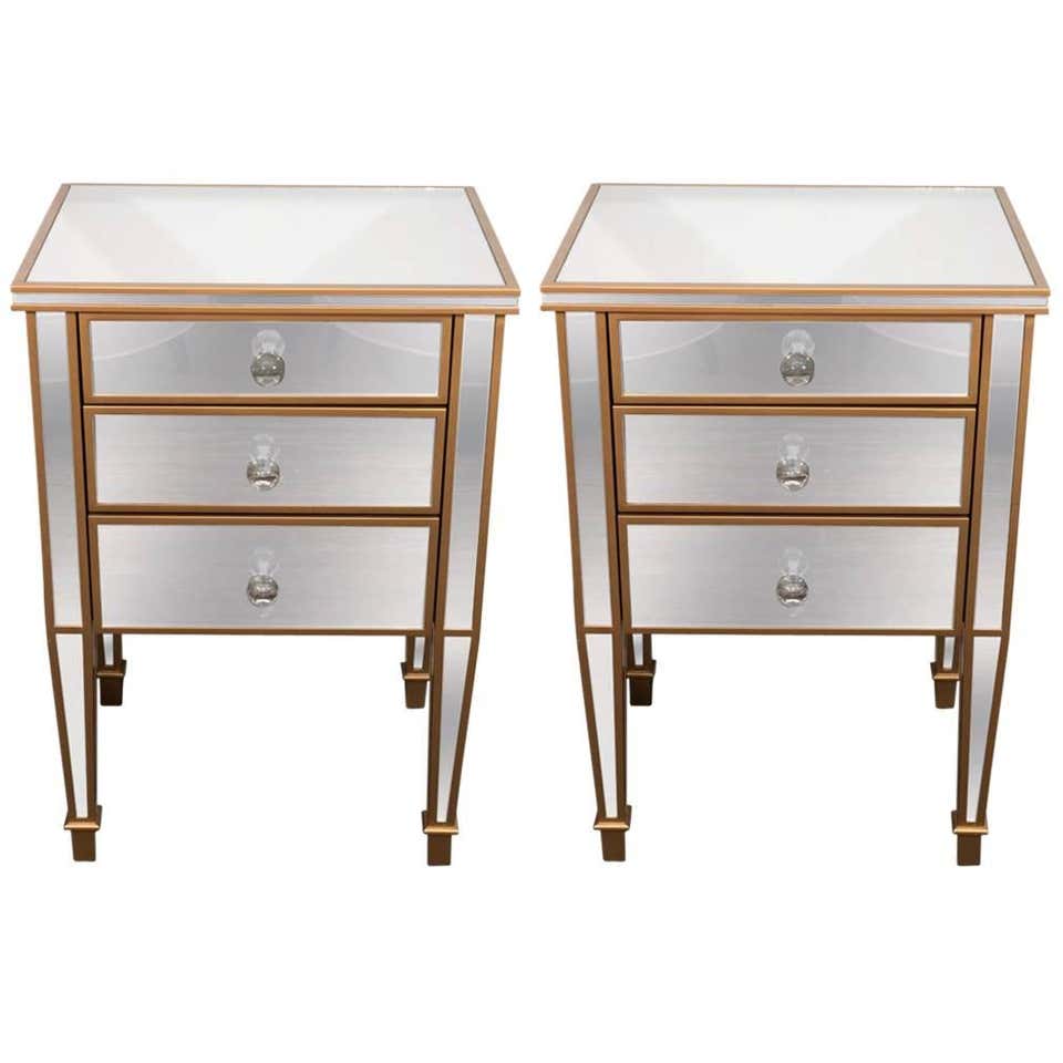 Pair of custom gold trim mirrored nightstands. Finished in starphire/clear mirror, gold wood trim and glass hardware. Customization is available in different sizes, finishes and hardware.