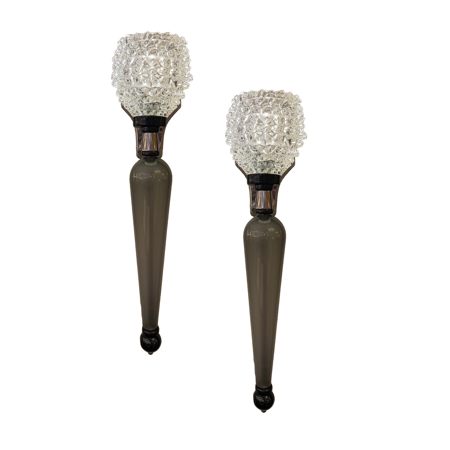Elegant, sculptural, and undeniably modern—this striking pair of Murano glass sconces features elongated, tapered bodies in smoky grey glass, contrasted by intricately textured crystal shades that catch and refract light beautifully. The geometric diffuser is crafted from hand-blown Murano glass, featuring a faceted, quilted surface that radiates brilliance when illuminated. Mounted on polished nickle hardware, these sconces offer a sleek, refined silhouette that’s both contemporary and timeless. Sold as a pair.