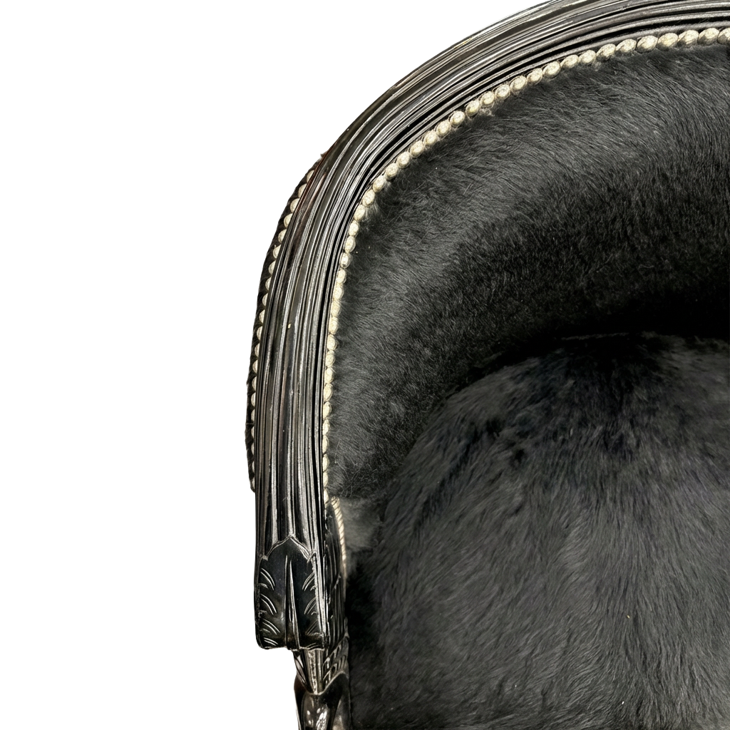 This striking pair of late 20th-century barrel-back chairs brings a bold, modern sensibility to a classic French bergère design. Each chair features a gracefully curved, fully upholstered back that flows into sculptural arms, all framed by a richly carved and ebonized wood structure finished in a deep black lacquer. A continuous line of nailhead trim elegantly defines the barrel-back silhouette, adding a tailored, architectural edge.