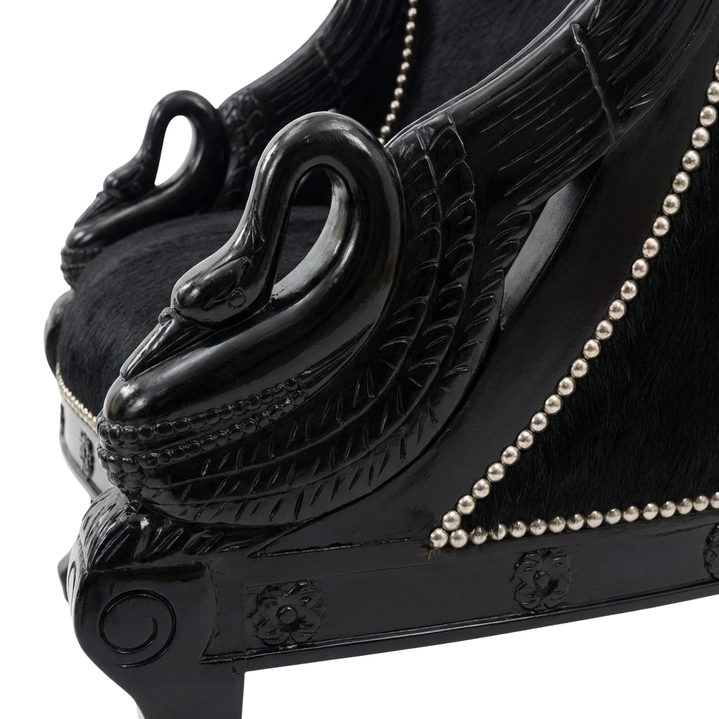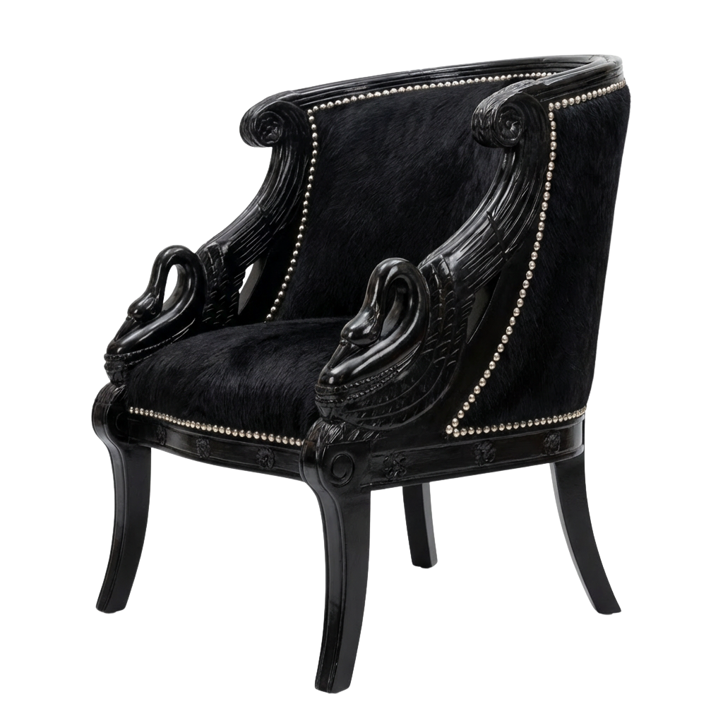 Both chairs come upholstered in supple black, hair-on cowhide, which softens the formality of the frame.