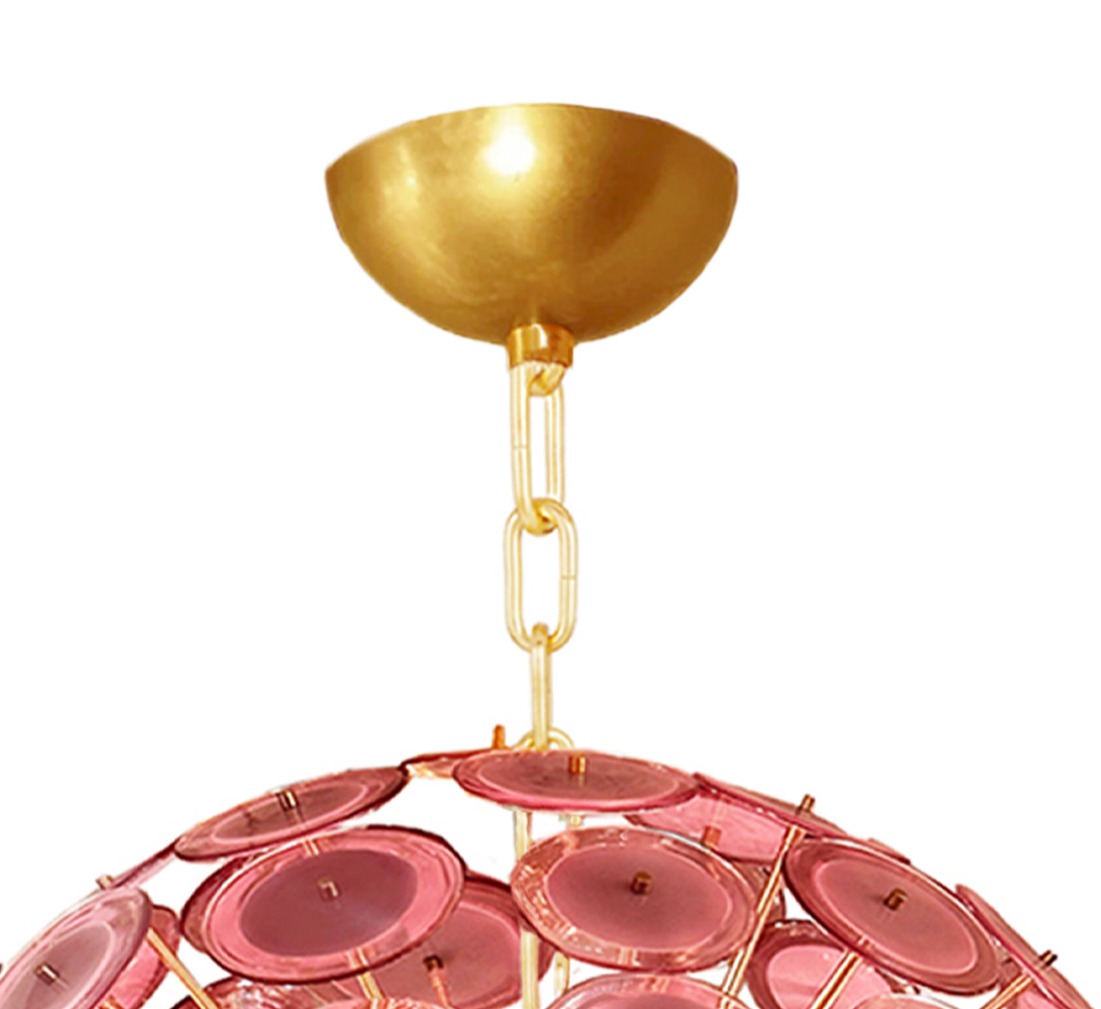 Exceptional pair of sputnik-style chandeliers made of hand-crafted amethyst color clear and lattimo Murano glass discs. The lattimo glass, which transalates to "milk glass" in Italian, creates an opaque white center within the disc that acts to block direct light, while simultaneously refecting it inward creating a warm glow of light from within. The chandelier bodies and canopies are finished in brushed brass The chandeliers are currently displayed in our New York showroom and priced as a pair. Also available individually and priced accordingly. Appear new.