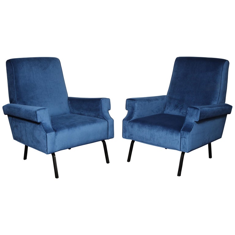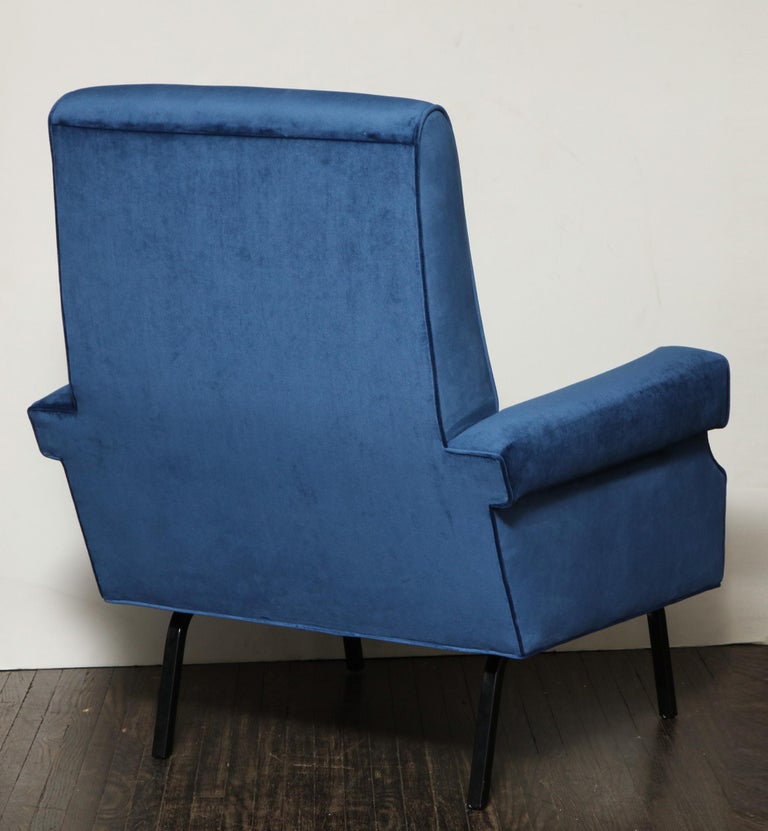 Pair of Mid-Century Modern blue velvet chairs with black iron legs. It was reupholstered recently in 2019.