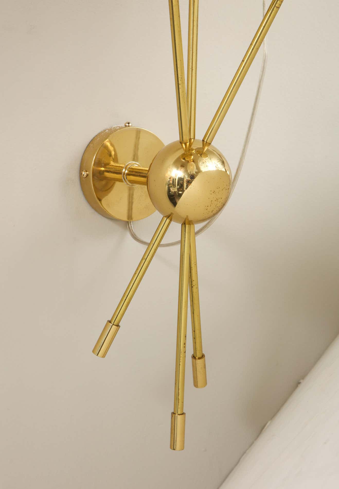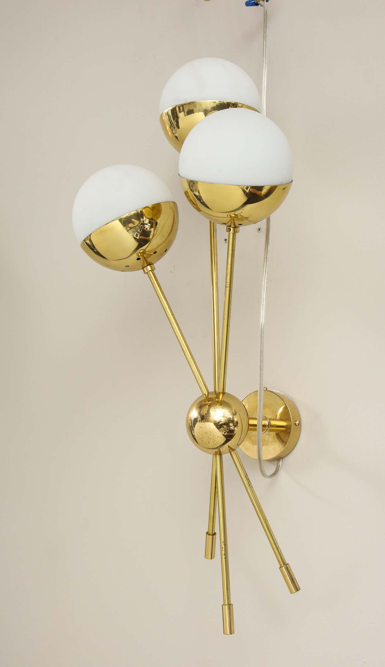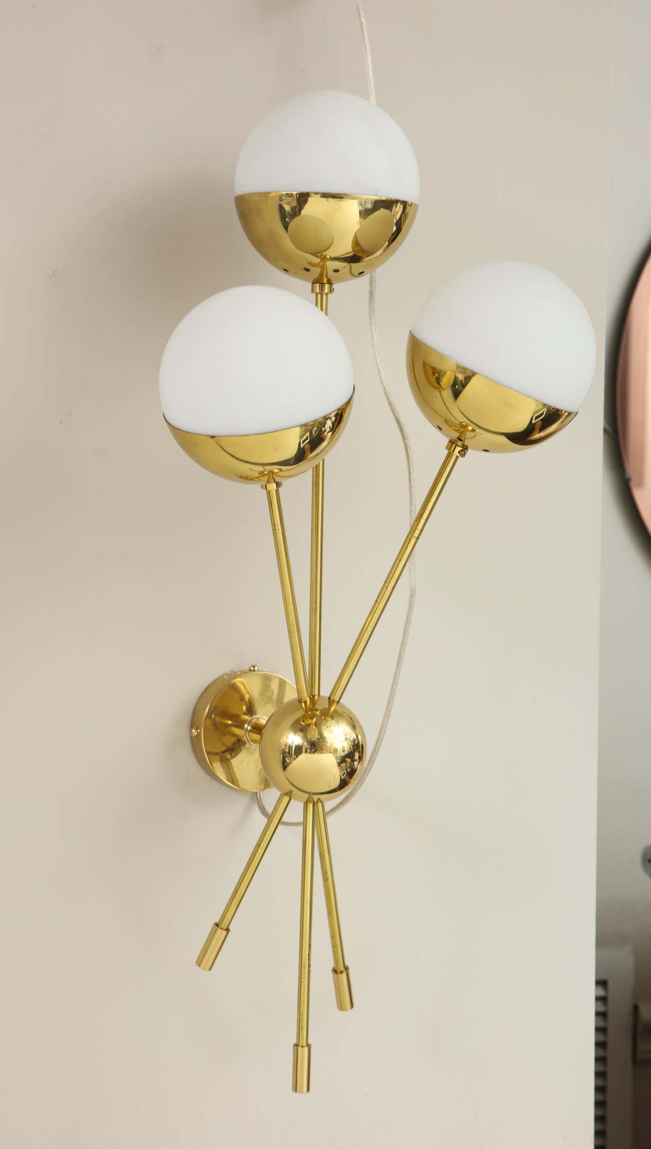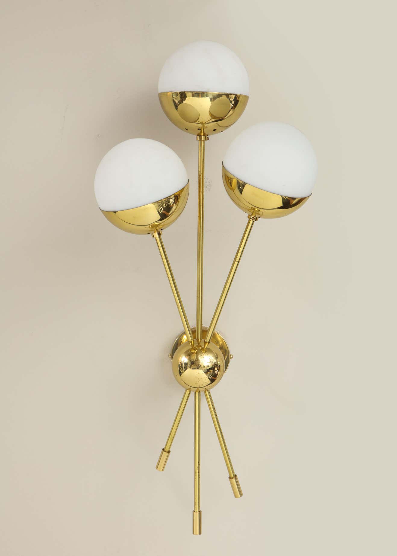 A chic pair of sconces with three opaline globes in polished brass, in the style of Stilnovo. Currently out of stock but available for custom order. Inquire with Venfield about customization, pricing, and estimated production lead time.