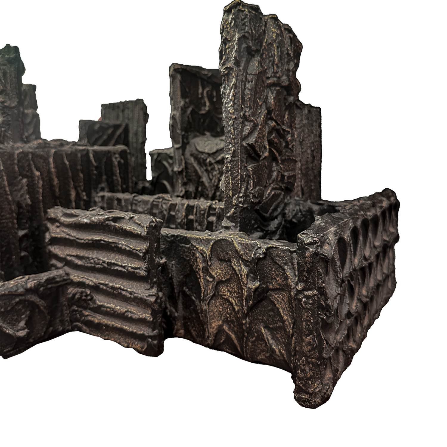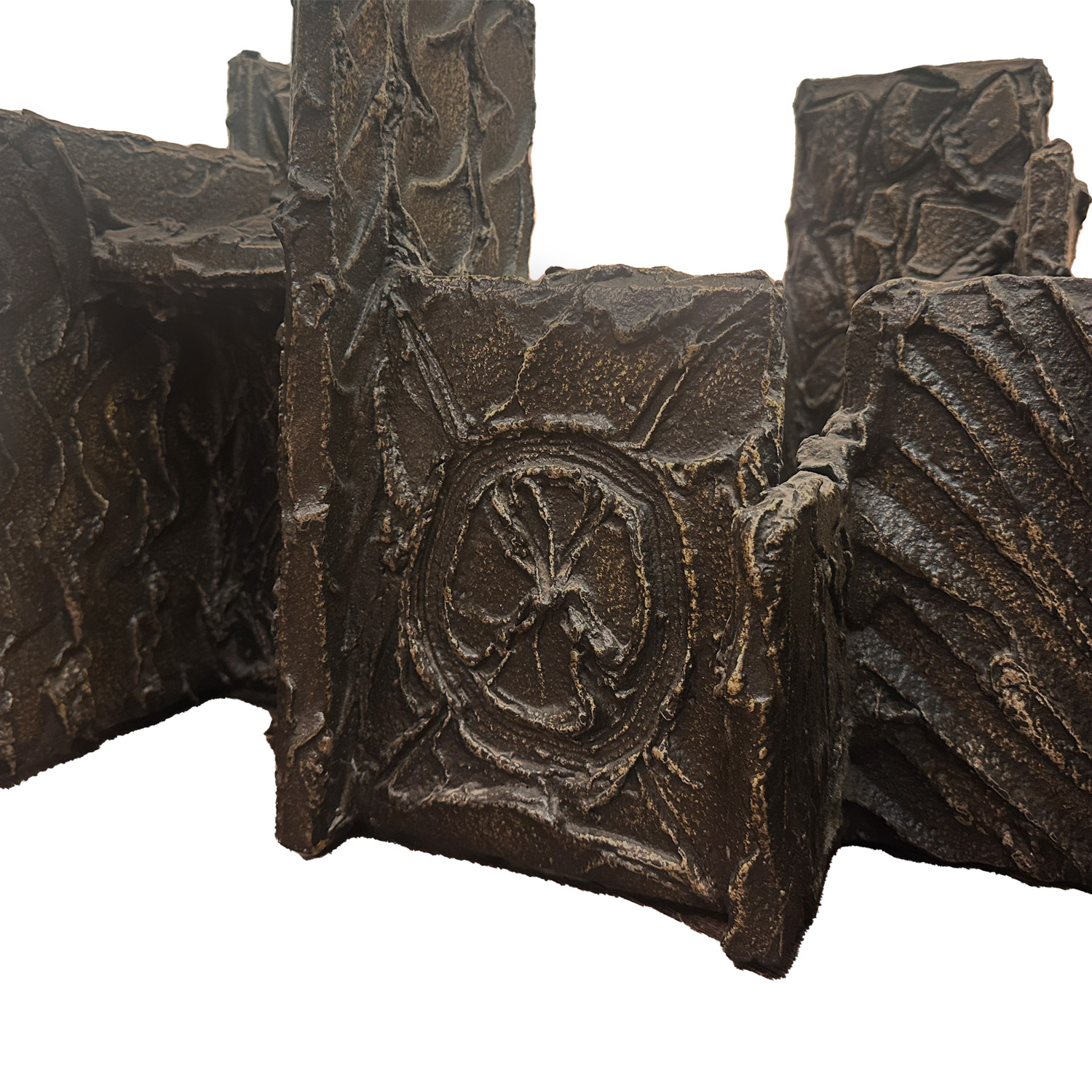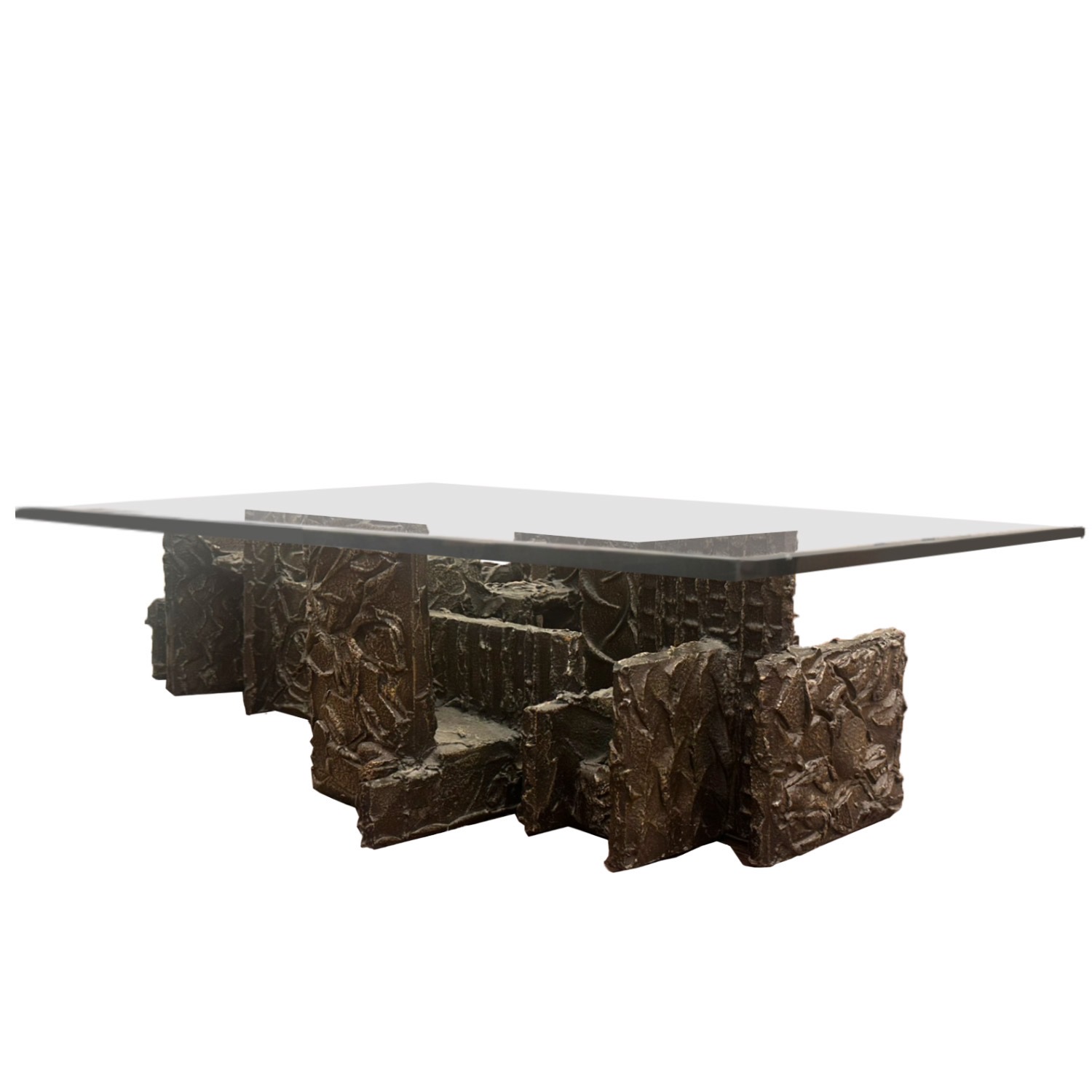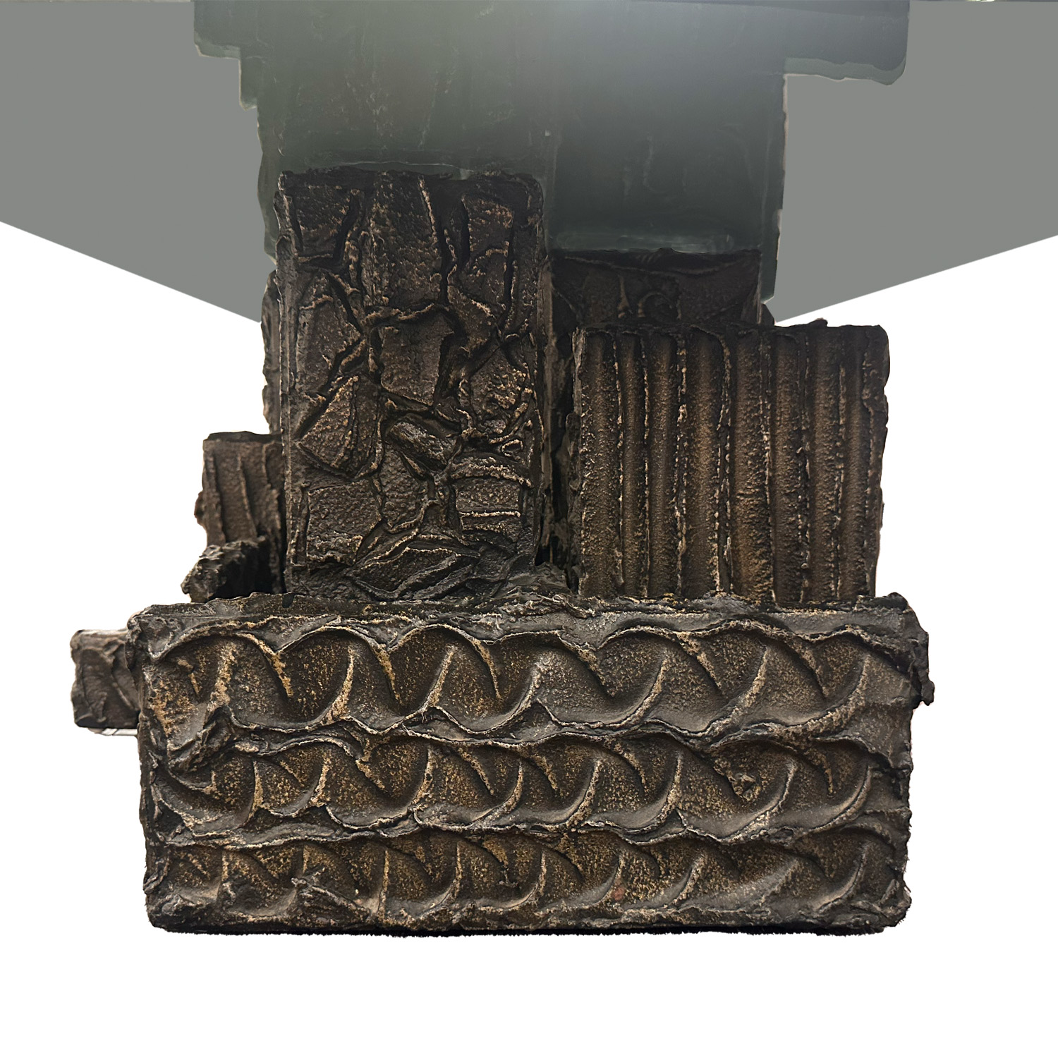 Borrowing from a technique used to repair the hulls of ships, Paul Evans combined traditional craft with experimental material and devised a process that created pieces that appeared to be cast bronze but retained the light weight and functionality of home furniture. The "sculpted metal" process consisted of applying an epoxy resin over a wood or light metal substrate and hand shaping the patterns and textures like one would mould clay. Once set the resin was sprayed with atomized bronze that was then welded under fire of a blow torch. Each piece created under the direct supervision of Evans. This table is signed and dated with the initials PE 70, on the lower, side section of the base. Dept. Glass top has a small.