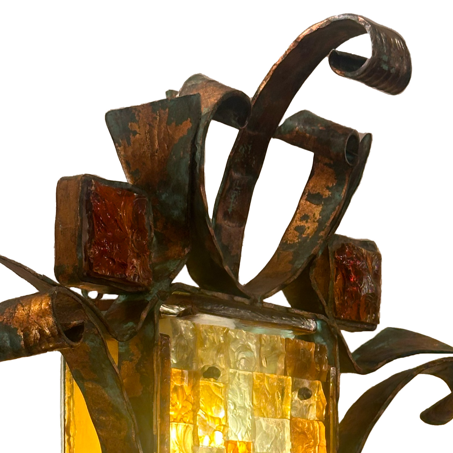 Lighting manufacturer Poliarte is best known for its innovative and artistic designs that seamlessly combine functionality with flair. The brand's commitment to the idea that lighting should be a form of artistic expression as well as a source of illumination has led to the creation of strinkingly visual pieces that can best be described as works of art and not just sources of light. This single large wrought iron and hammered Murano glass sconce is exemplary of the Poliarte philosophy. Its large bands of scrolled iron are purely ornamental and not integral to the function of the sconce. The intricate metal framework holds no light element or shade. Its sole purpose is aesthetic, providing symmetry and balance to the otherwise abstract and random pattern of the glass. Italian, 1960s.