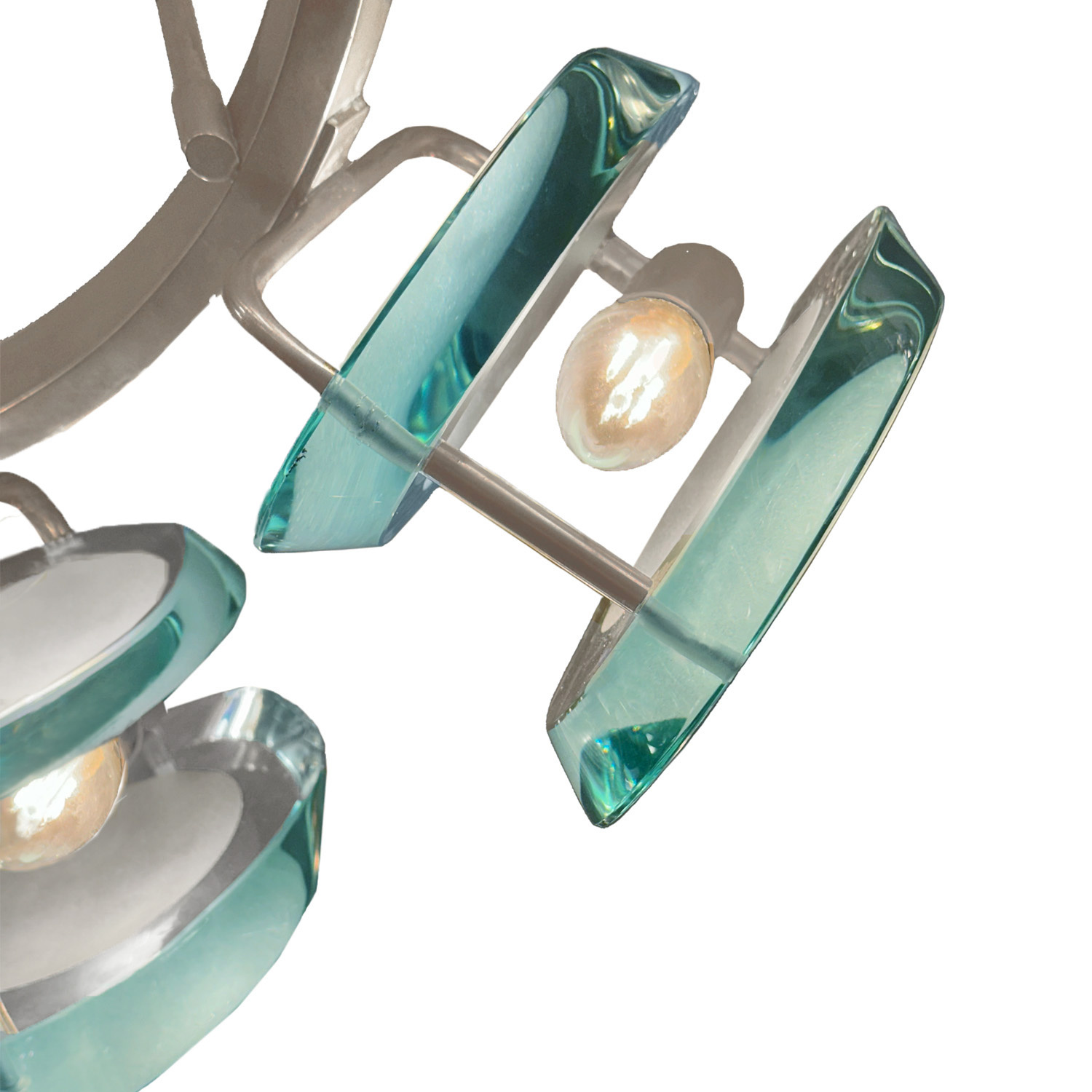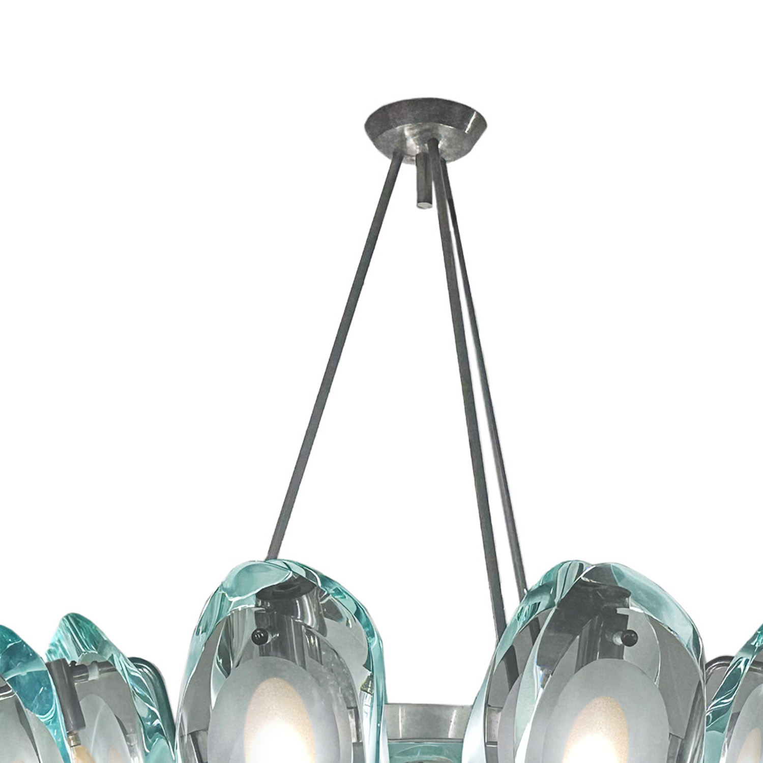 Rare Model 1088 chandelier with 9 dual lens sets of thick studio glass, sand-blasted at the center to diffuse light and configured around a suspended ring of nickel plated brass. Designed by Max Ingrand for Fontana Arte. Italy, 1959